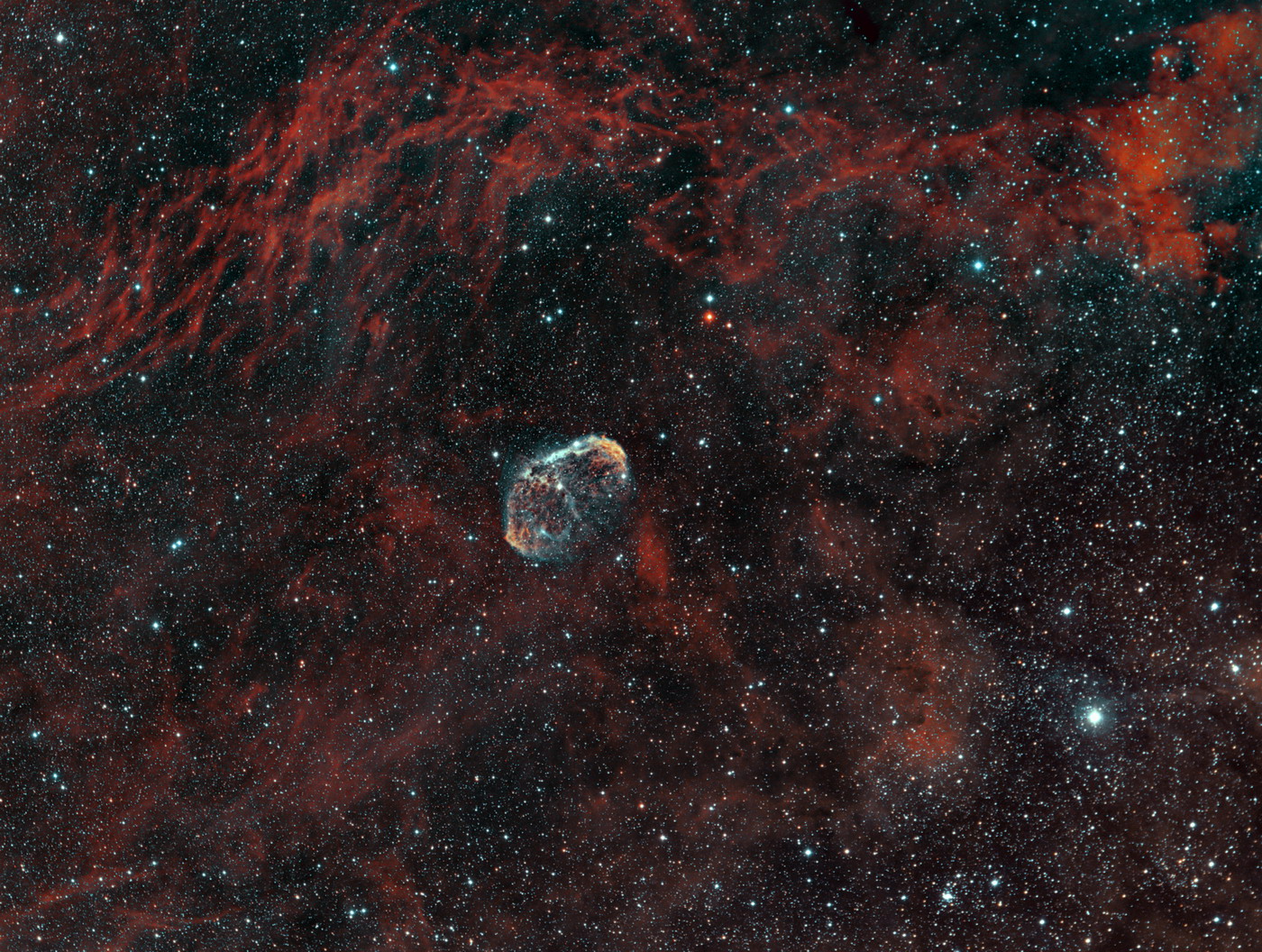 Bellissimo complesso Nebulare nel Cigno. Al centro NGC6888 che risplende per riflessione, a seguito dell’energia ricevuta durante l’esplosione della stessa supernova.