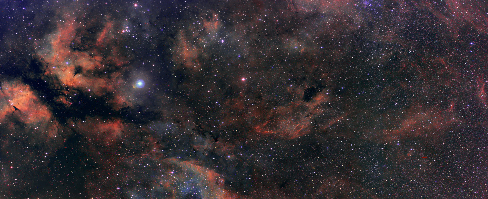 Spettacolare complesso nebulare in piena via lattea nella costellazione del Cigno. Mosaico di 4 pannelli eseguita in combinazione (S2HAO3) con Takahashi Sky-90 f/4.5, SBIG STF8300m (H-Alpha), SBIG ST10-XME (S2, O3), su Skywatcher EQ6 Pro.