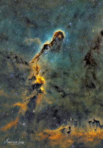 IC 410 (in basso al centro nella foto): nota talvolta come nebulosa Girino a causa dei suoi filamenti nordorientali (visibili nella foto), è una nebulosa a emissione di grandi dimensioni visibile nella costellazione dell’Auriga. Ad essa è legata l’ammasso aperto di stelle NGC 1893, formato da giovani stelle massicce e piuttosto disperse. La regione è sede di importanti processi di formazione stellare.