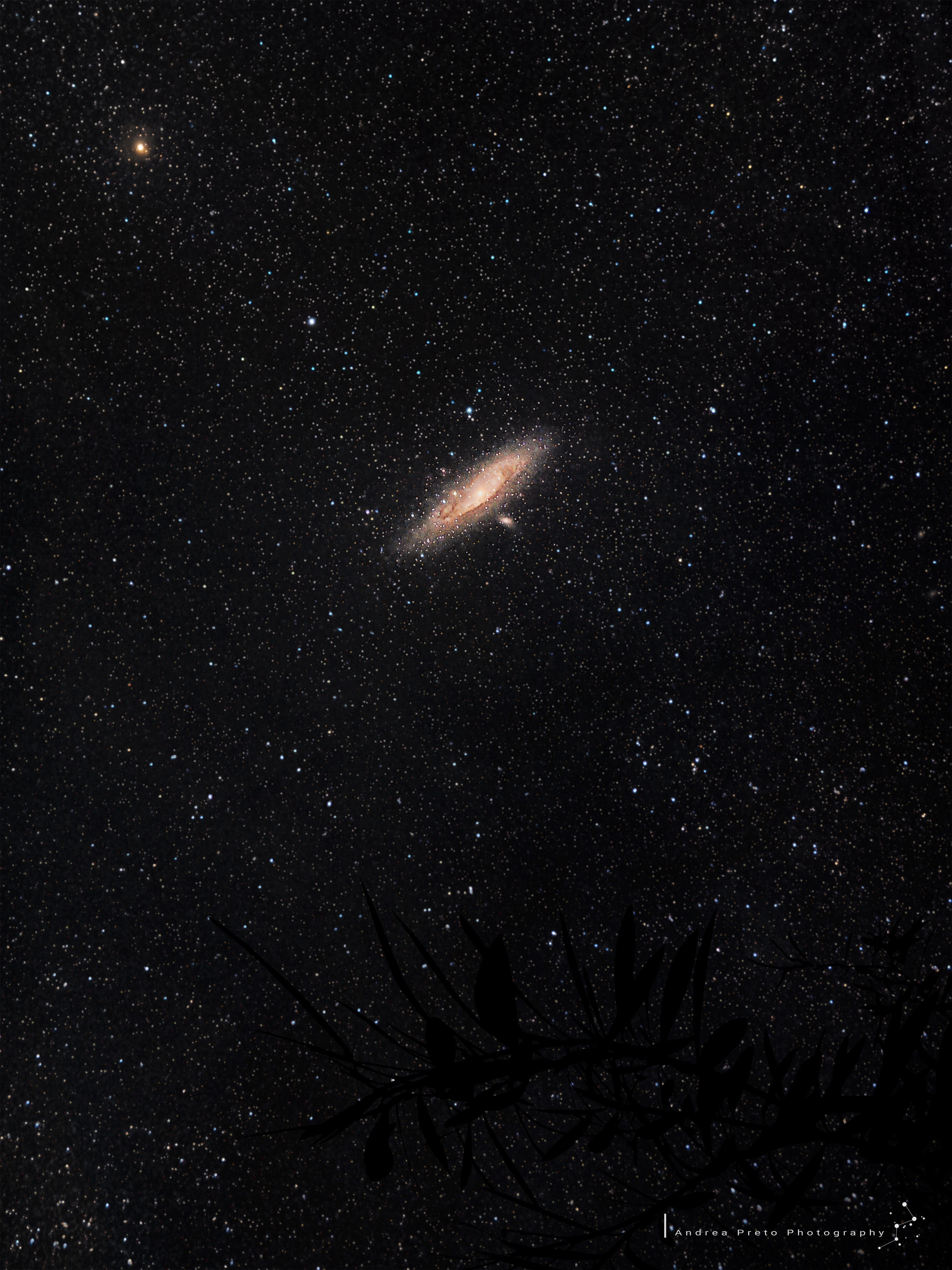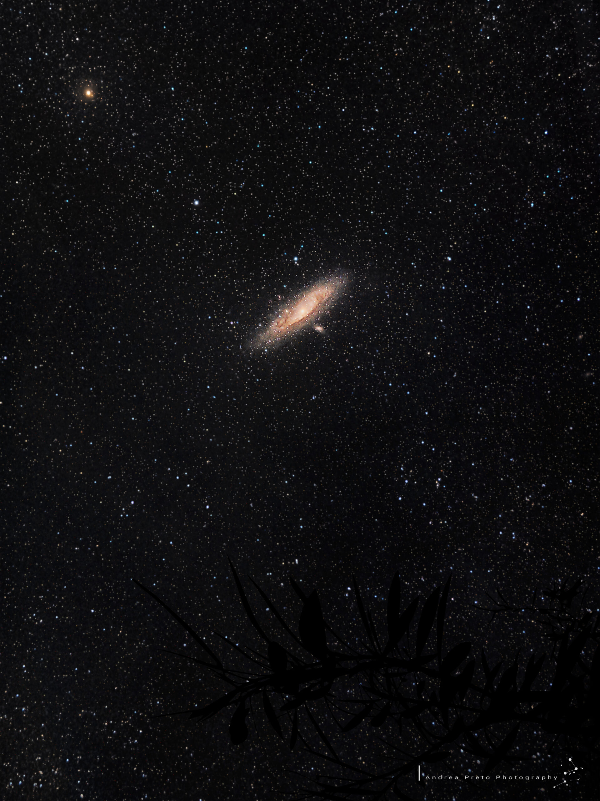 Quando ero piccolo, dietro casa, in corso Valdocco a Torino, c’era un fotografo. Andavamo a comprare quantità industriali di rullini di diapositive. In vetrina facevano bella mostra di sè alcuni telescopi. Tra tutti un Meade da 8" (prima ancora che uscissero le serie lx5 ed lx200), blu, enorme, bellissimo e misterioso. Lo guardavo meravigliato tutte le volte dal basso in alto. E sognavo. Ai piedi del telescopio c’era una piccola cornice marrone che inquadrava una foto della galassia di Andromeda. In bianco e nero. A quei tempi si usavano le pellicole, per cui due ore di esposizione erano… due ore di esposizione. Su un singolo fotogramma. Si poteva fare ben poco se la foto veniva male. Io non so chi fosse l’autore di quella foto, ma era la cosa più bella e "fantascientifica" che avessi mai visto e mi è rimasta appiccicata addosso, un ricordo nettissimo ed indelebile. Quest’estate in Grecia a Stoupa (sotto Kalamata) ci ho provato. Ho pensato che era venuto il momento. La mia Andromeda, ripresa da lontano, piccolina, quasi persa in quel cielo immenso e senza confini. Eppure così grande.