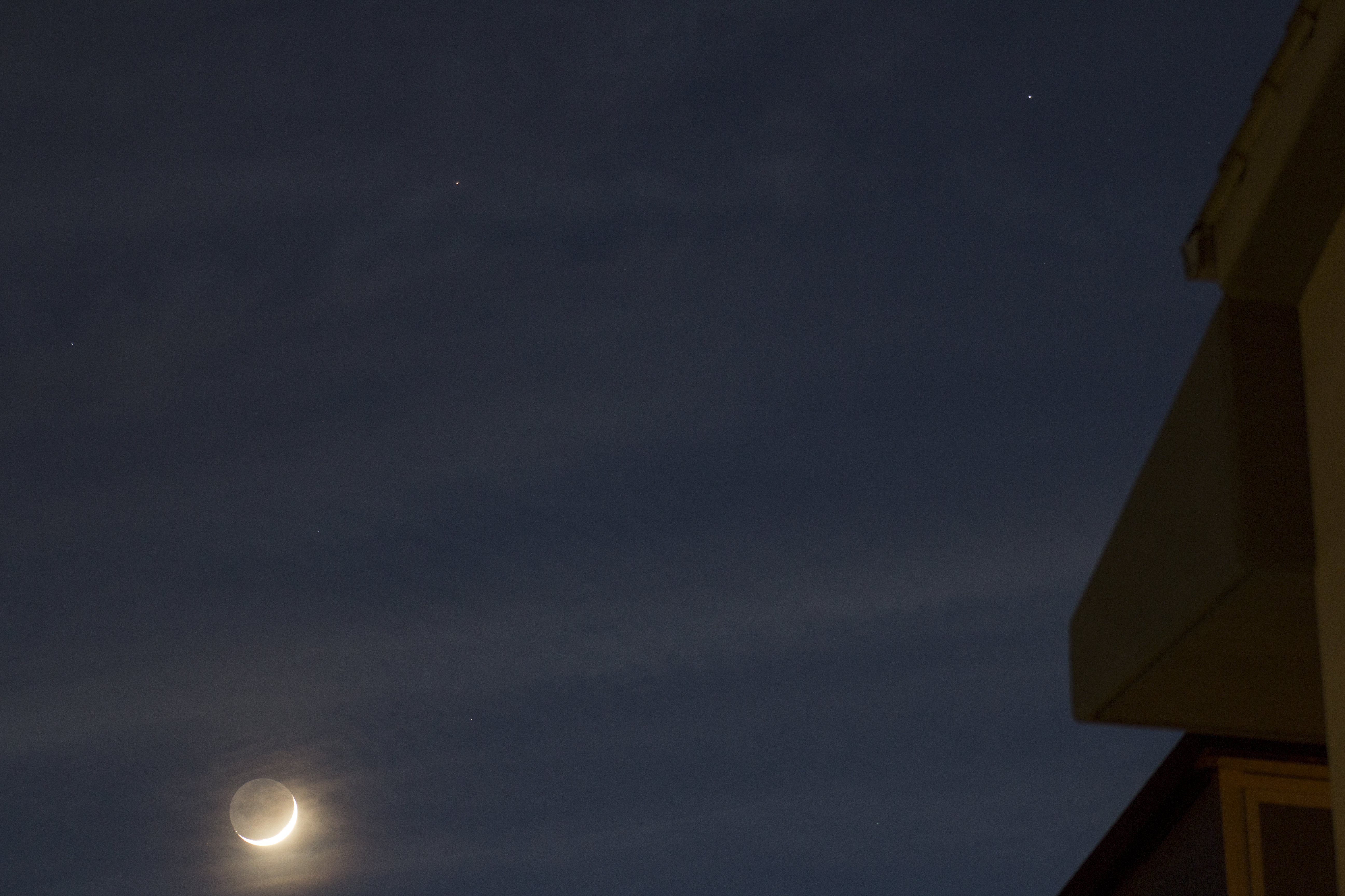 Metti un cielo appena velato, aggiungi una sottile falce di Luna, un pianeta (Marte) e una stella (El Nath) e lo spettacolo è servito!