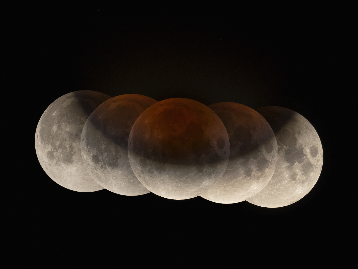 In questa fotografia si vedono molto bene le 5 Lune dell’intera fase dell’Eclisse parziale con parte della Luna in ombra, di color rosso, e una parte in penombra. L’elaborazione e la sovrapposizione delle immagini sono state eseguite con Photoshop.