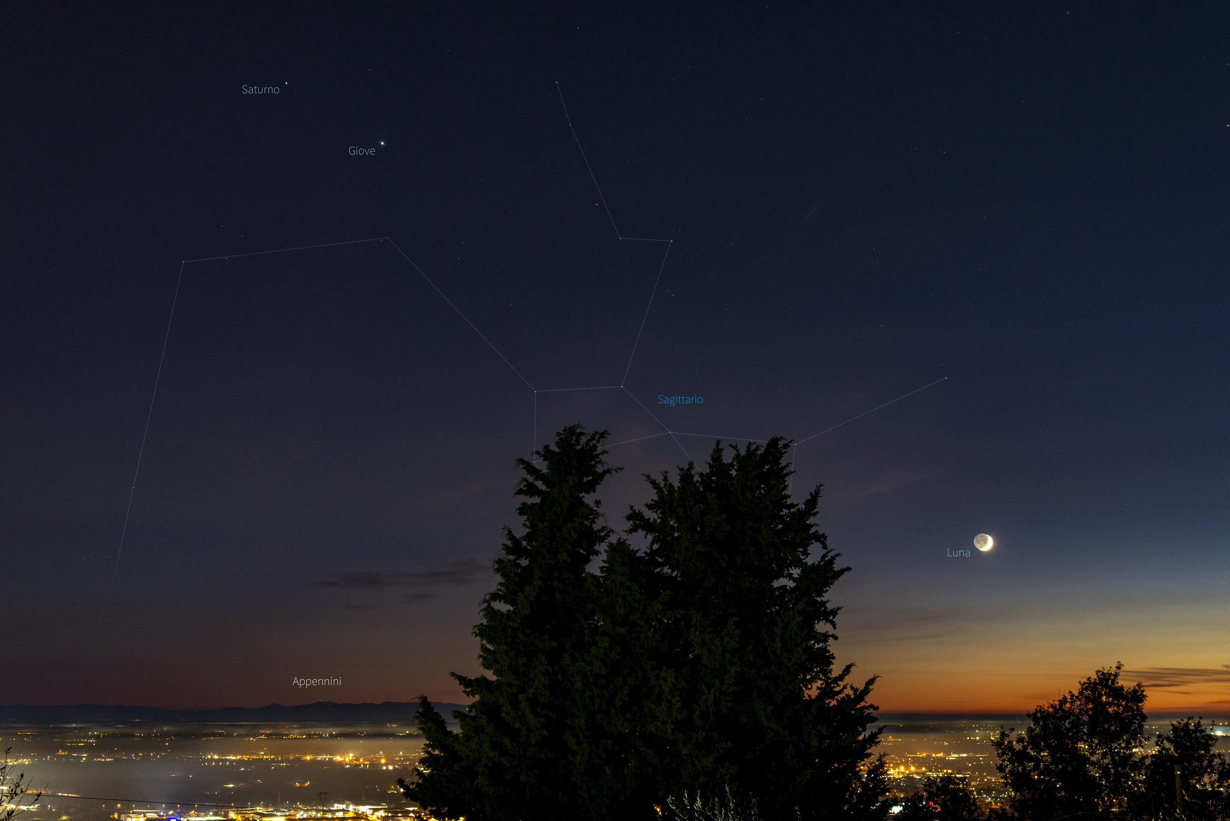 Una bella congiunzione al tramonto con Luna, Giove e Saturno nel Sagittario.