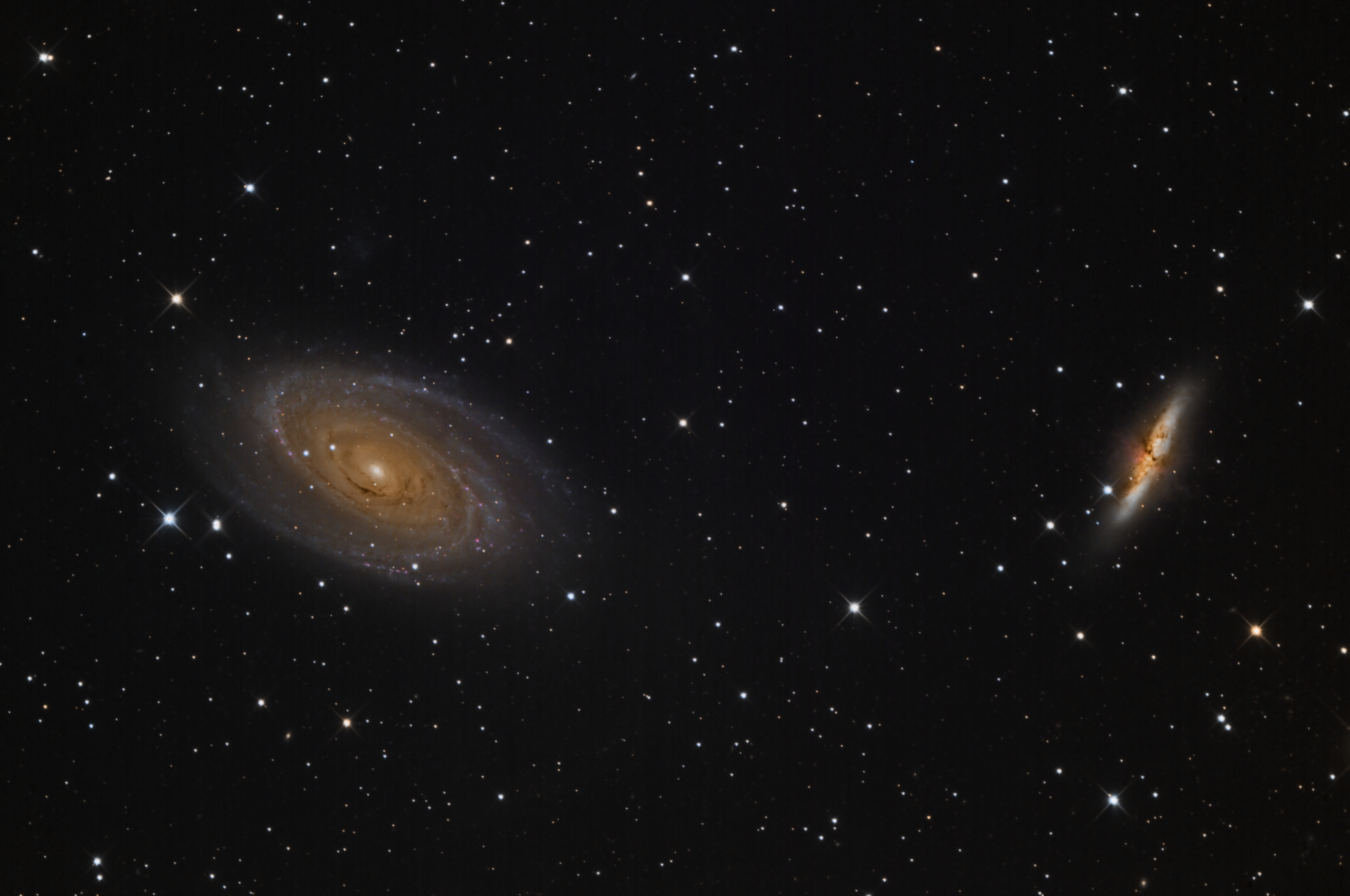 Uno scatto della famosa galassia di Bode e della sua "vicina" M82, Galassia sigaro. Ques’ultima è un esempio di galassia starburst nella quale il processo di formazione delle stelle è particolarmente violento. La galassia Sigaro possiede un tasso di formazione stellare di circa 10 volte maggiore rispetto a quello di una galassia "normale".