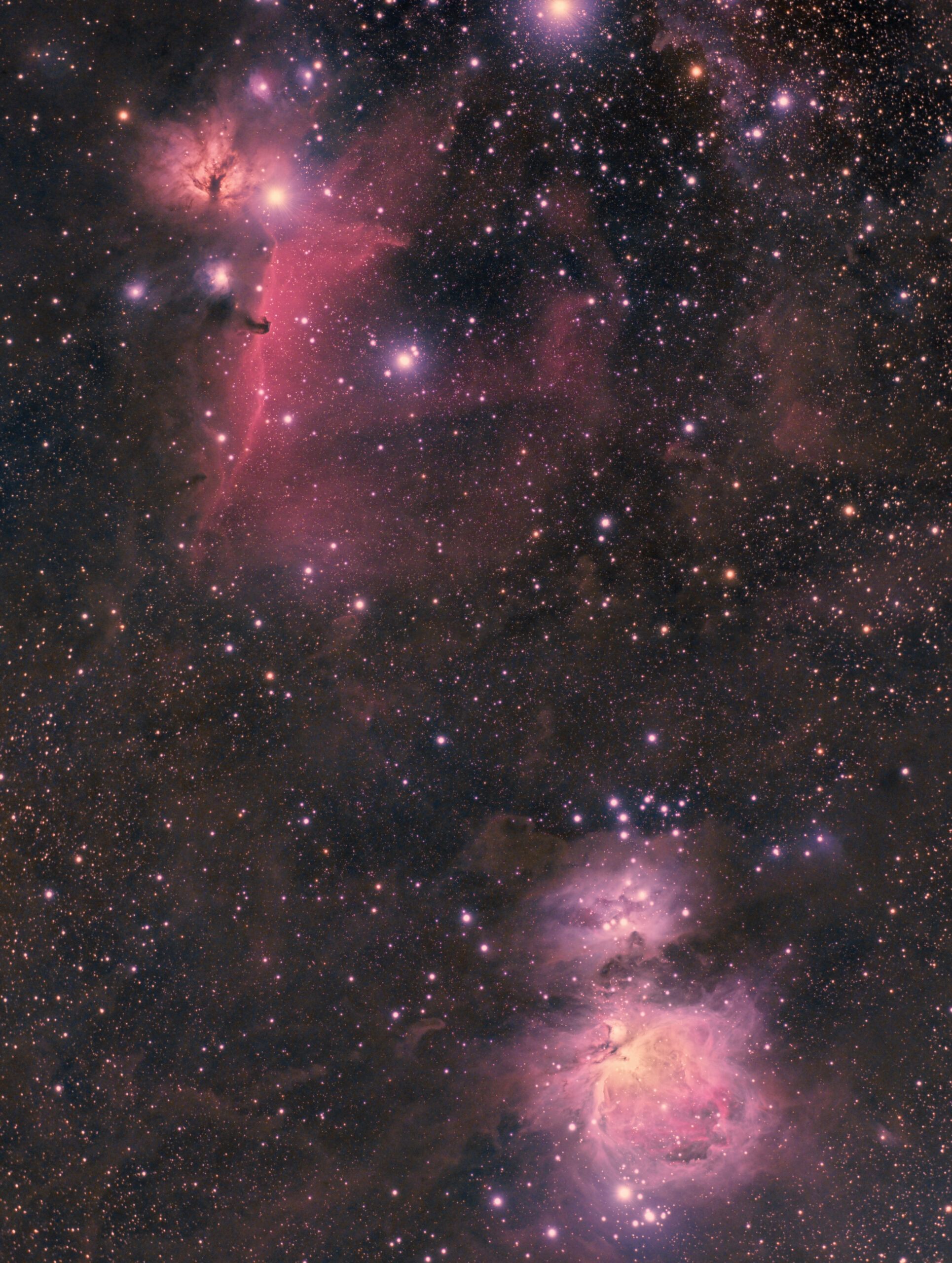 Partendo dall’alto è appena visibile la stella centrale che forma la cintura di Orione, Alnilam; procedendo in diagonale da questa verso la sinistra dell’immagine troviamo Alnitak. La regione attorno a questa stella è tra le più fotografate… e a buon ragione! Attorno a Alnitak si trovano delle bellissime nebulose come la Fiamma, chiaramente individuabile sulla sinistra della stella, la nebulosa ad emissione IC434, formata dalla zona di colore rosso che si estende verso il basso partendo sempre dalla stella Alnitak e la famosa nebulosa Testa di Cavallo, che in realtà è un complesso nebulare che oscura una parte della IC434 stagliandosi davanti ad essa e quindi diventando visibile.