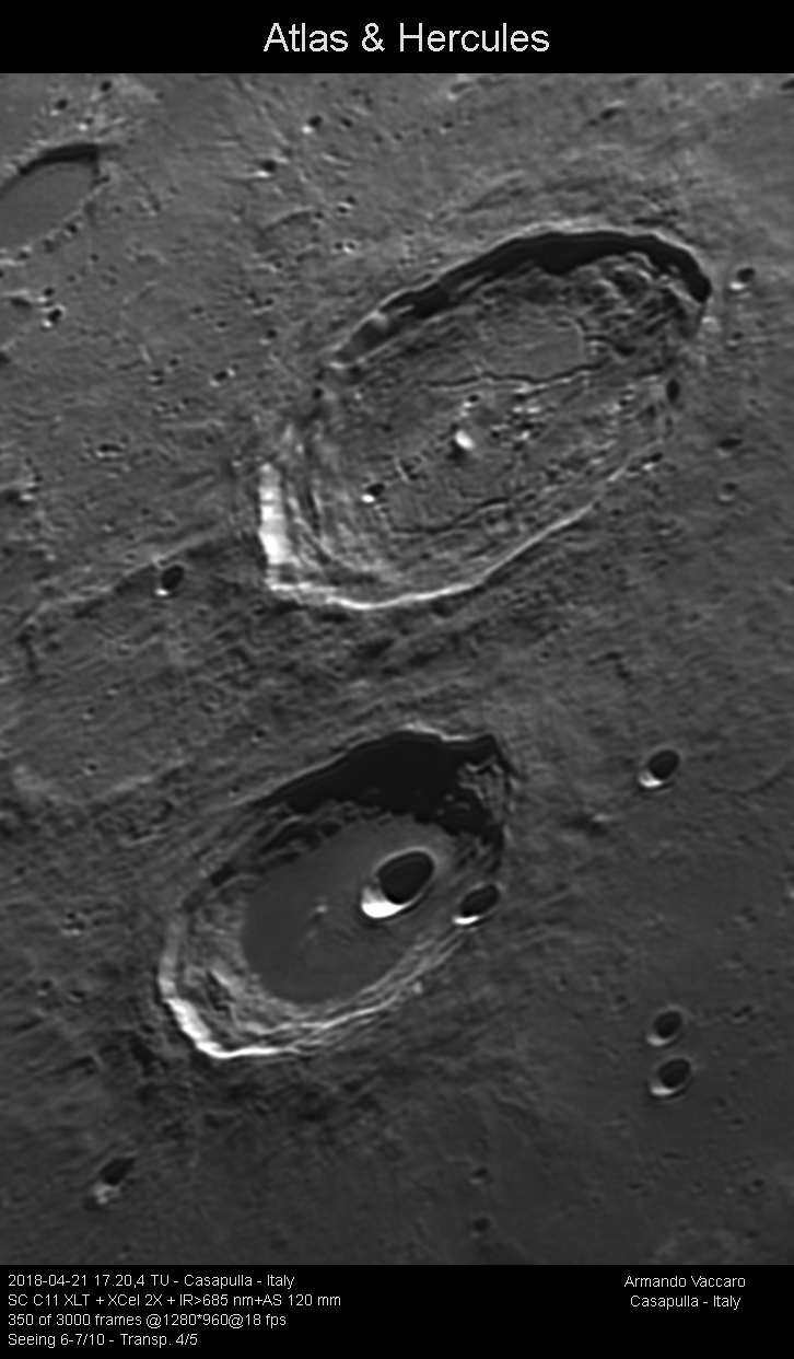 E’ una delle più affascinanti coppie di crateri lunari. Atlas è il più grande (87 km) mentre Hercules il più piccolo (71 km). Atlas ha un fondo fratturato da rimae e due zone con depositi piroclastici (più scuri) tipici del proprio vulcanesimo. Hercules ha invece un aspetto differente con modifiche diverse in quanto la lava copre interamente tutto il suo fondo.