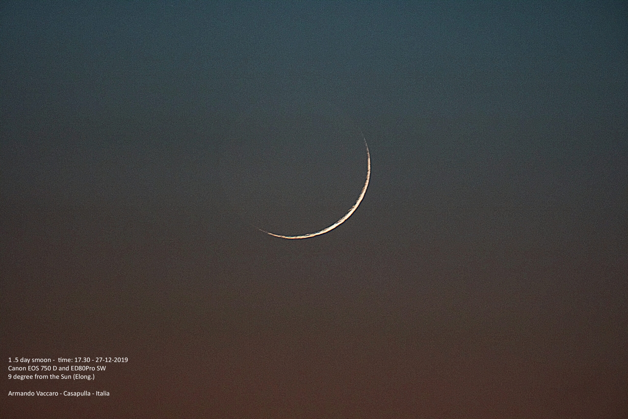 Al tramonto, subito dopo che il sole sparisse dietro l’orizzonte, è stato possibile rintracciare nel crepuscolo serale il falcetto di Luna.
