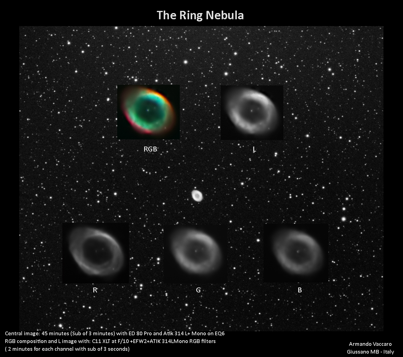 M57, nebulosa anulare della Lira, soggetto semplice ma ricco di informazioni sulla dinamica evolutiva di una planetaria. Il collage è frutto di riprese con C11 XLT, subframes da 3 secondi, 2 minuti a canale, a fuoco diretto con Atik 314 L+ Mono ed il campo esteso invece con ED 80 Pro con Atik 314L+Mono 45 minuti totali con subframe da 3 minuti cadauno. Pieno centro città
