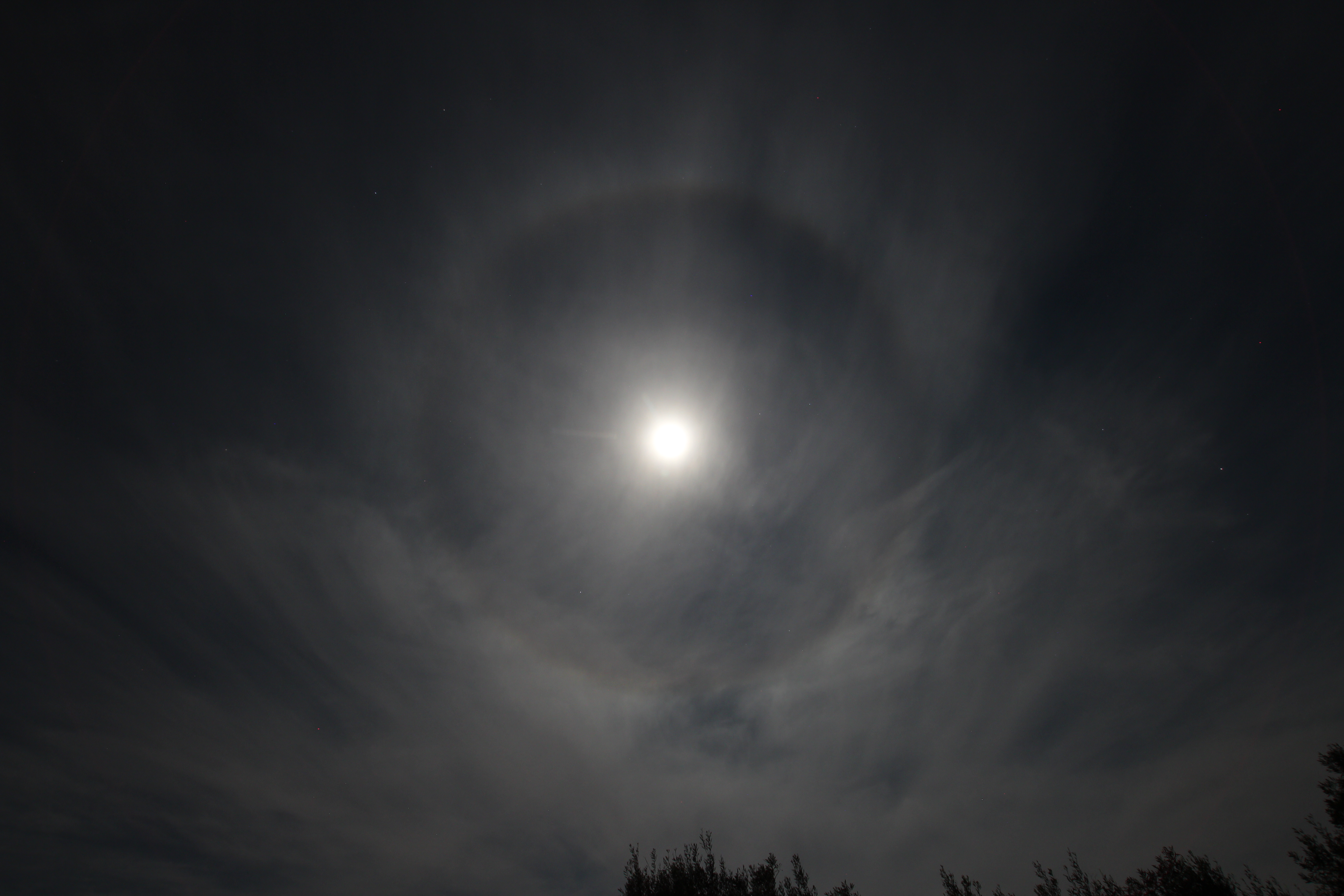 Ci eravamo alzati prestissimo per seguire l’eclissi di Luna, purtroppo il cielo si copriva sempre più man mano che montavamo gli strumenti. Guardando la Luna ad un certo punto ci siamo accorti di questo alone che sembrava chiedere di essere fotografato….in pratica questa è la foto più bella che abbiamo portato a casa.