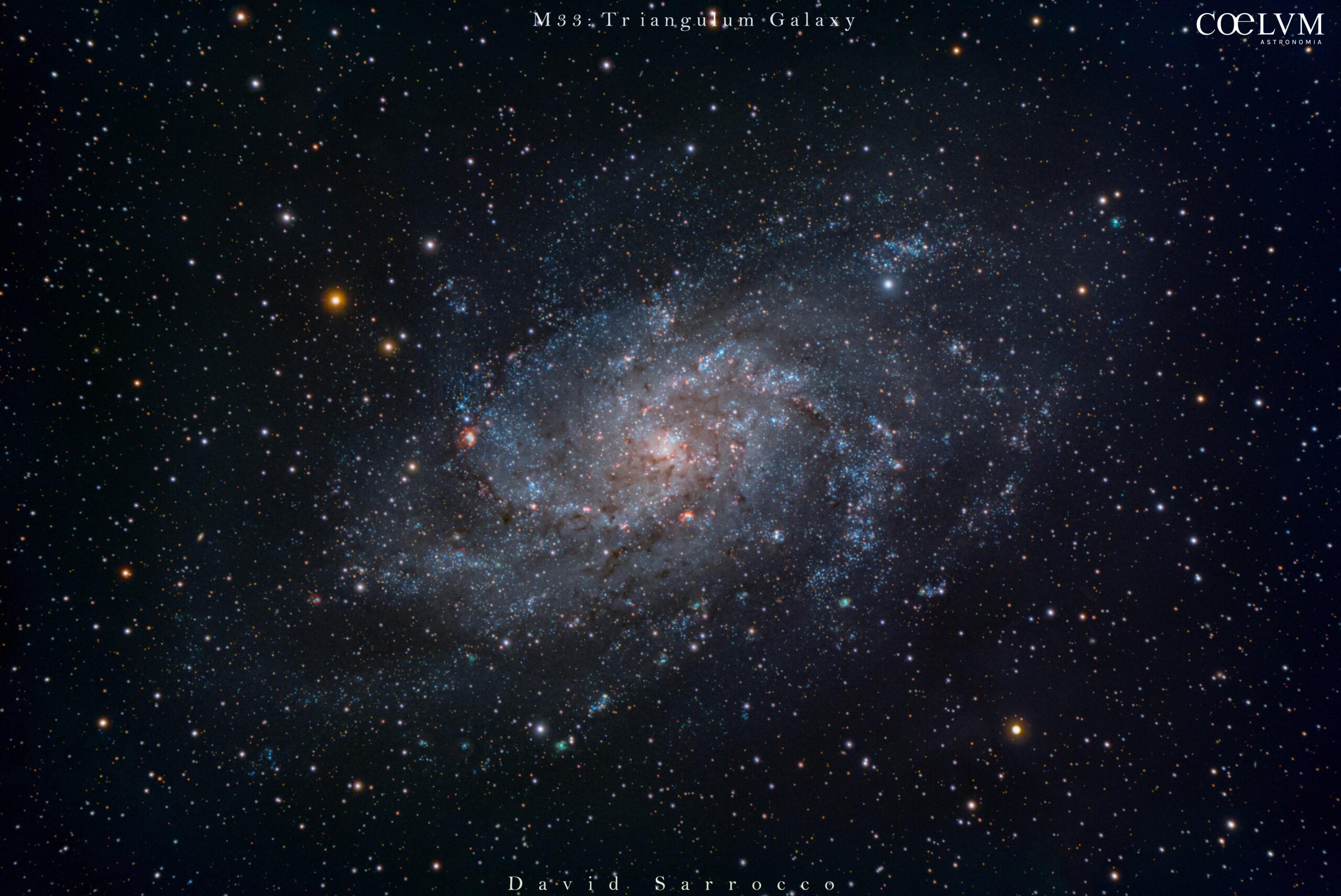 Situata a una distanza di 2,7–2,8 milioni di anni luce, la Galassia del Triangolo (M33) si stima sia composta da circa 40 miliardi di stelle. Curiosamente, sembra non possedere un buco nero supermassiccio al suo centro, ma ospita invece un sistema binario stella–buco nero (M33-X)! È affascinante notare come sia possibile osservare chiaramente singole stelle di colore blu (molto giovani!) lungo i bracci della galassia, oltre a varie nebulose di colore rossastro sparse al suo interno — regioni di idrogeno ionizzato, vere e proprie fucine di stelle! Sebbene fu classificata da Charles Messier come il 33º oggetto del suo catalogo, studi recenti attribuiscono la scoperta della galassia al sacerdote Giovanni Battista Hodierna nel 1654.