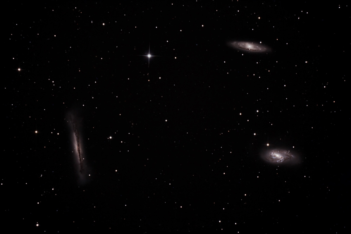il famoso trio di galassie nel leone. ripresa fatta con un riflettore skywatcher 250 mm su montatura EQ 6 e canon 350d modificata dal rifugio Vaccera ( provincia di Torino)