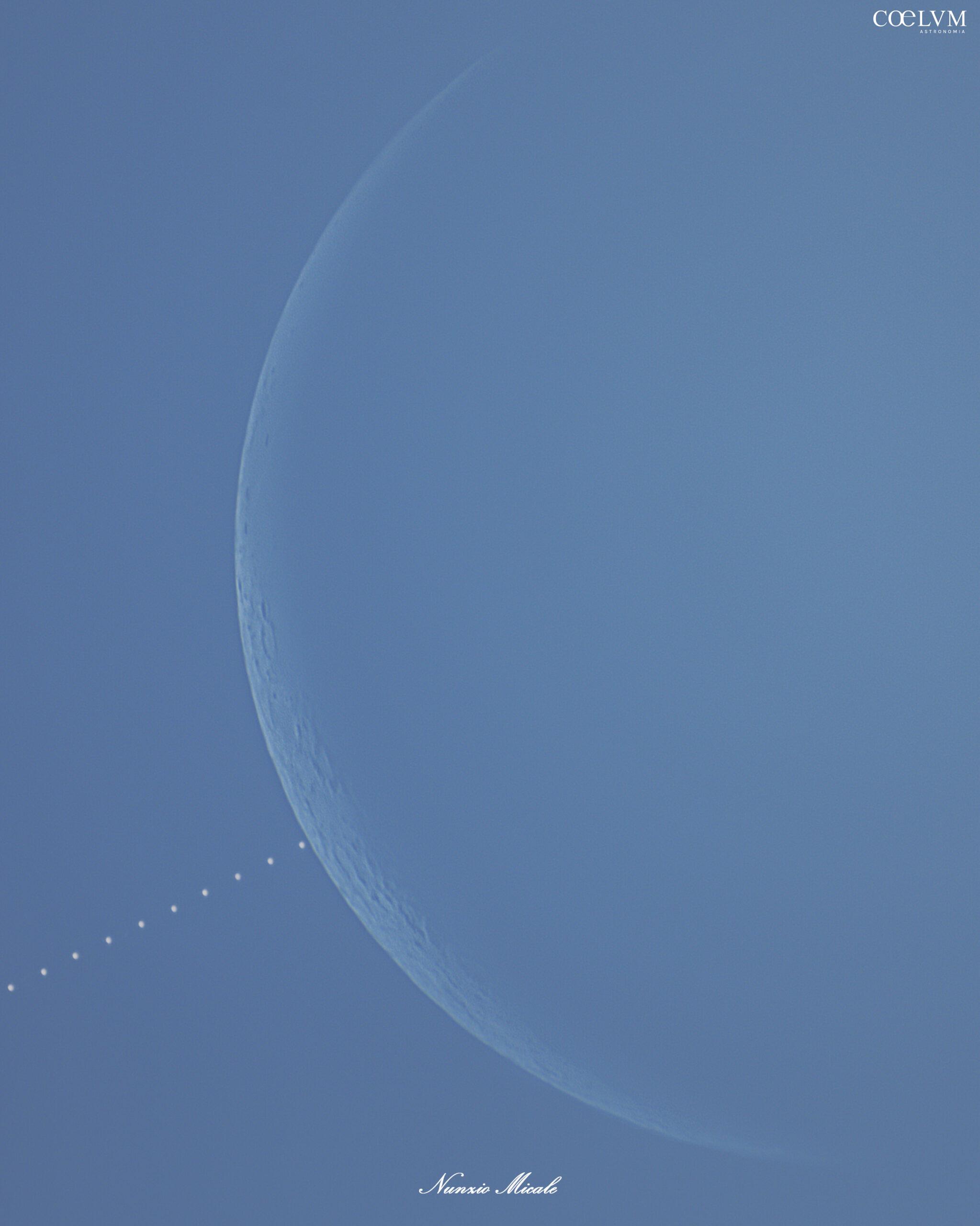 Ripresa in sequenza del fenomeno che ha visto il secondo pianeta del Sistema Solare essere occultato dalla nostra Luna. Davvero bello, ma rispetto al 2023, davvero faticoso! Per la Luna: 25 scatti sommati ed elaborati, Canon eos 70D su C9,25″” e riduttore di focale, montatura advanced Vx NexStar+, ISO 320, 1/1250″. Per Venere: Ripresa di 11000 frames, 60 fps, stack 40%, ASI 224 Mc su Skywatcher 127/1500 + Barlow 2x + ZWO atmospheric dispersion corrector. Sequenza: Diversi scatti poi selezionati, Canon eos 70D su C8″ e riduttore di focale, montatura advanced Vx NexStar+, ISO 320, 1/1250″. Ovviamente, per una questione di risoluzione, la ripresa di Venere è stata aggiunta nelle corrette posizioni.