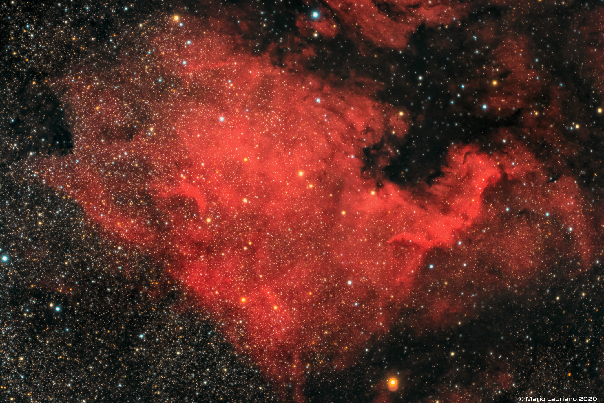 NGC 7000 è una nebulosa a emissione nella costellazione del Cigno, vicino a Deneb (la coda del cigno e la sua stella più luminosa). La forma della nebulosa ricorda quella del continente del Nord America, completo di un prominente Golfo del Messico.