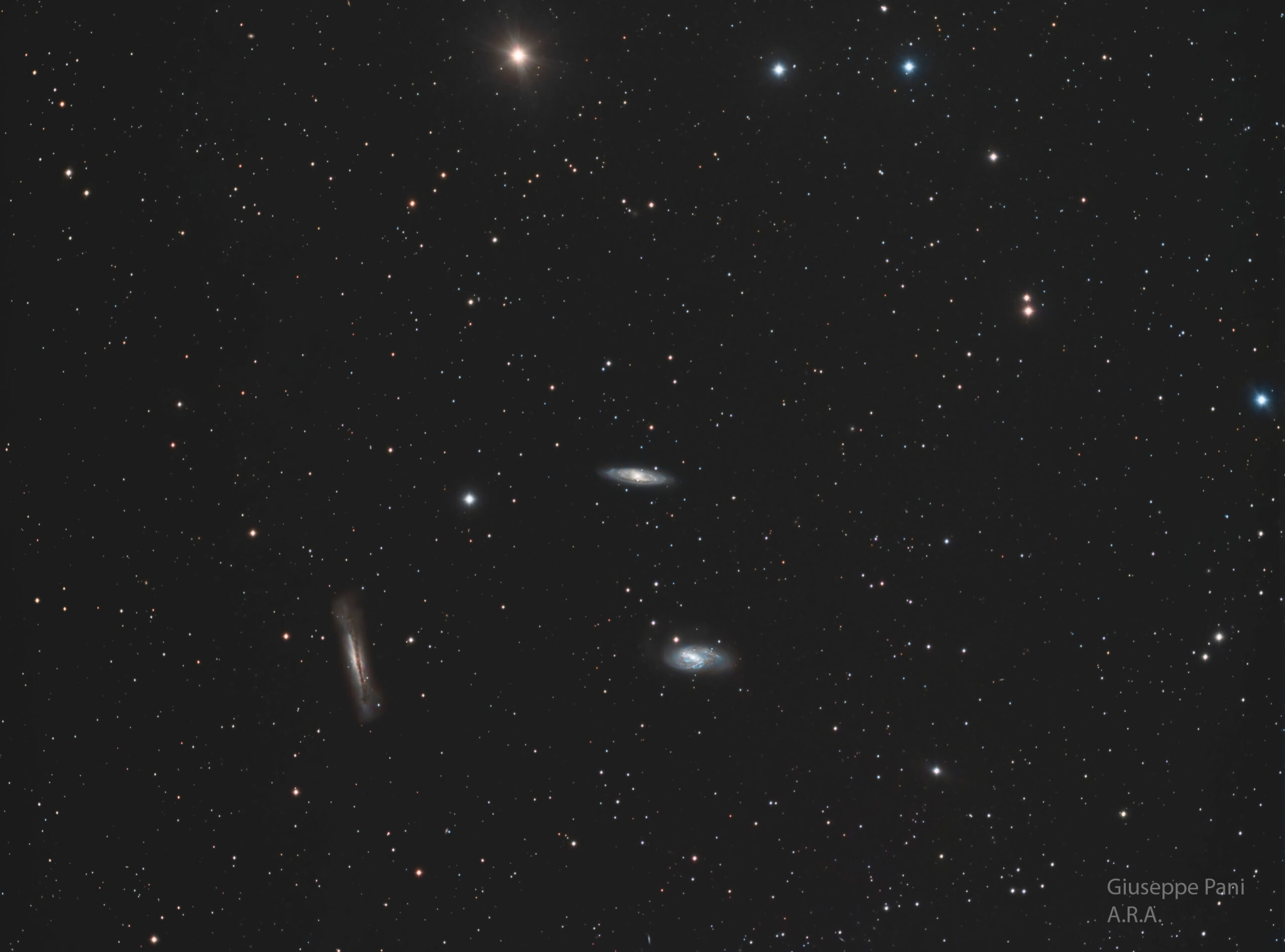 Il tripletto del Leone, così chiamato perchè formato principalmente da tre galassie M65 e M66, due galassie a spirali separate da circa 20 secondi ‘arco, e la galassia NGC 3628, galassia a spirale non barrata caratterizzata dalla fascia di gas e polveri presenti nel suo piano equatoriale.