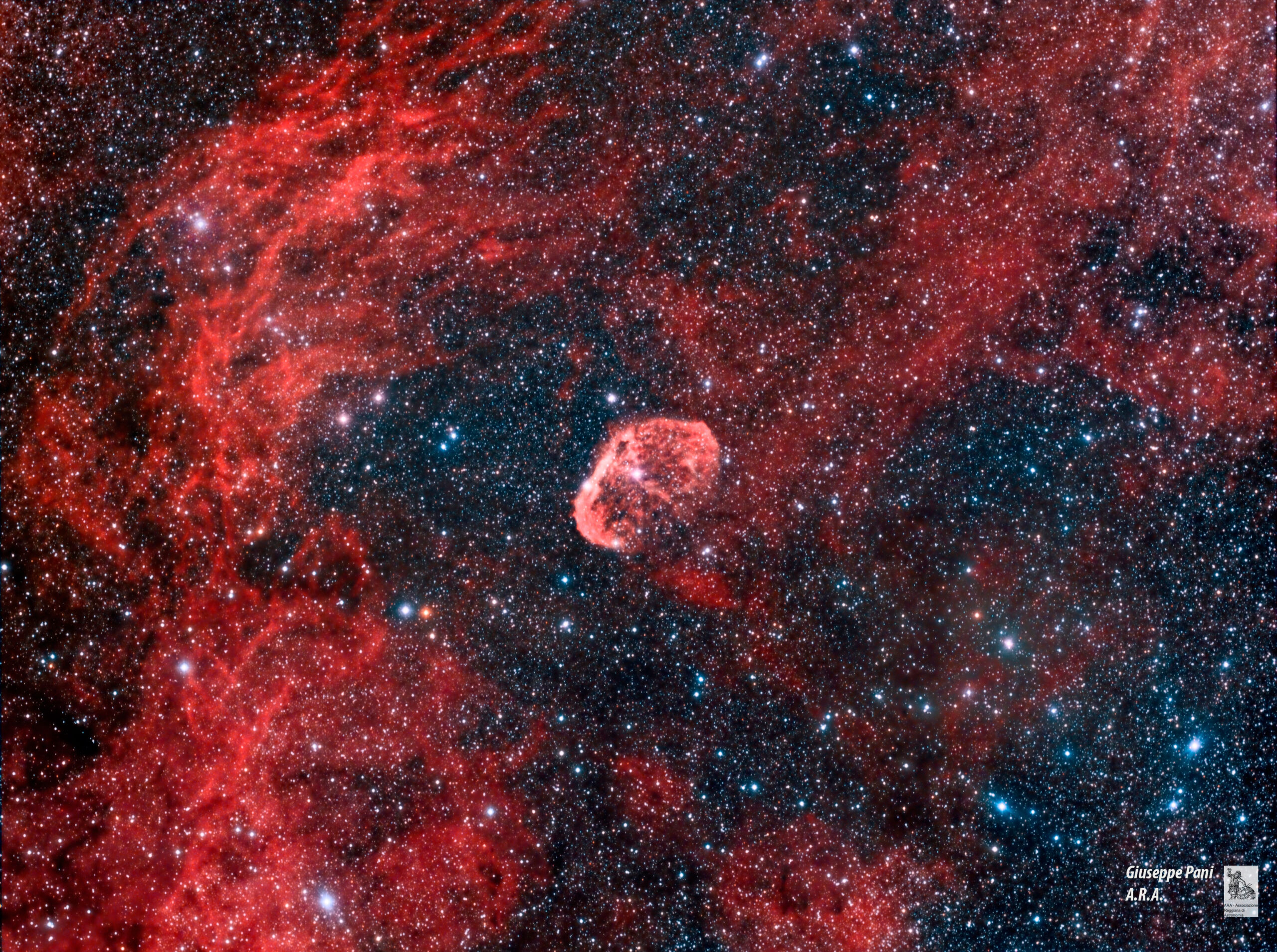 Foto eseguita in due sessioni di cui una in pianura utilizzando il filtro Halpha per abbattere l’inquinamento luminoso e l’alltra in montagna rigurdanti le riprese LRGB.