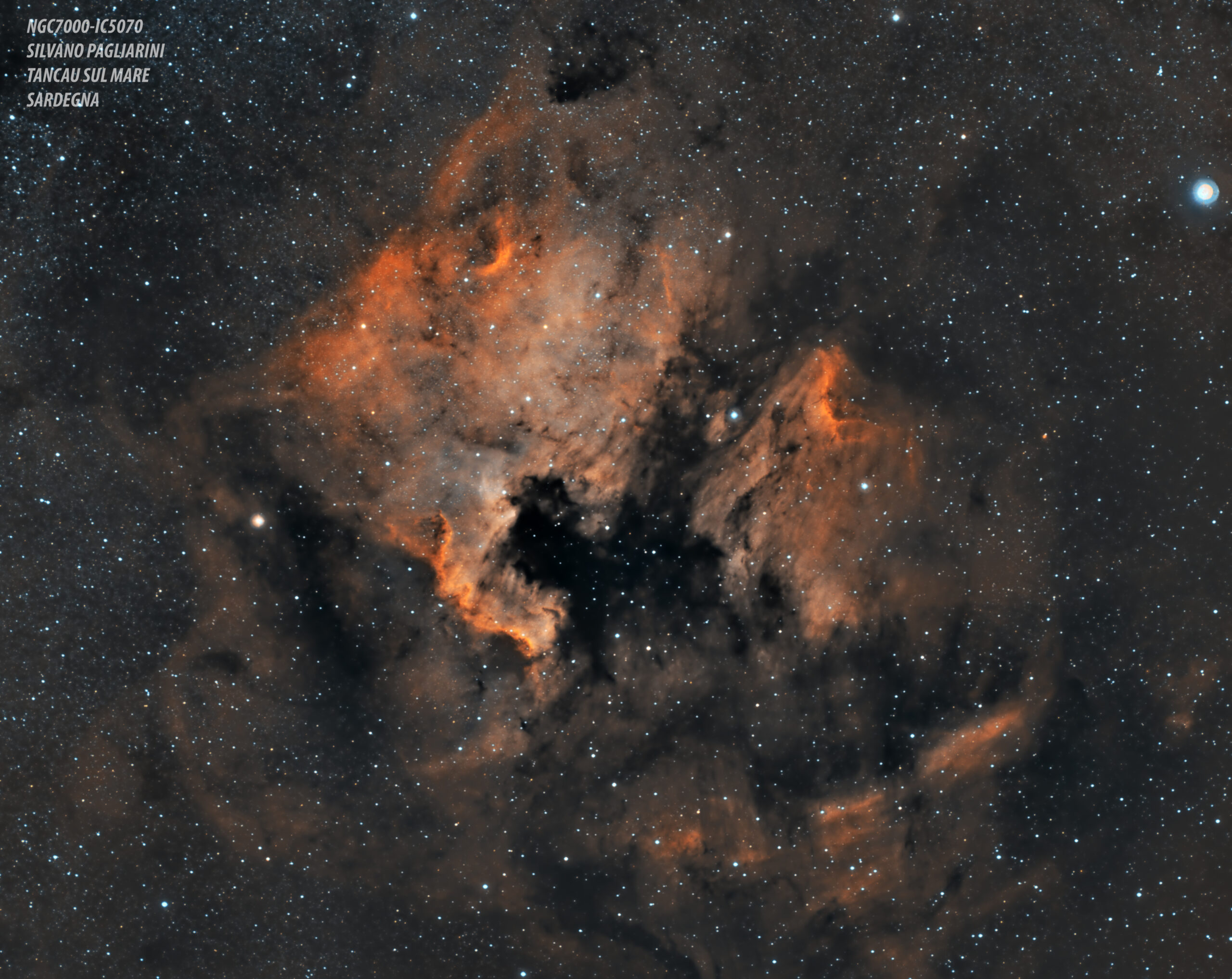 La nebulosa Nord America, numero di catalogo NGC7000 IC 5070, è una delle nebulose che sovente appare su innumerevoli libri e riviste di astronomia. Caratterizzata dalla sua forma particolare, di cui non si può far a meno di notare la stretta somiglianza con il continente nord americano, è una nebulosa ad emissione i cui gas sono eccitati dall’emissione ultravioletta della stella HD199579 si 6.0 mag e spettro O6.