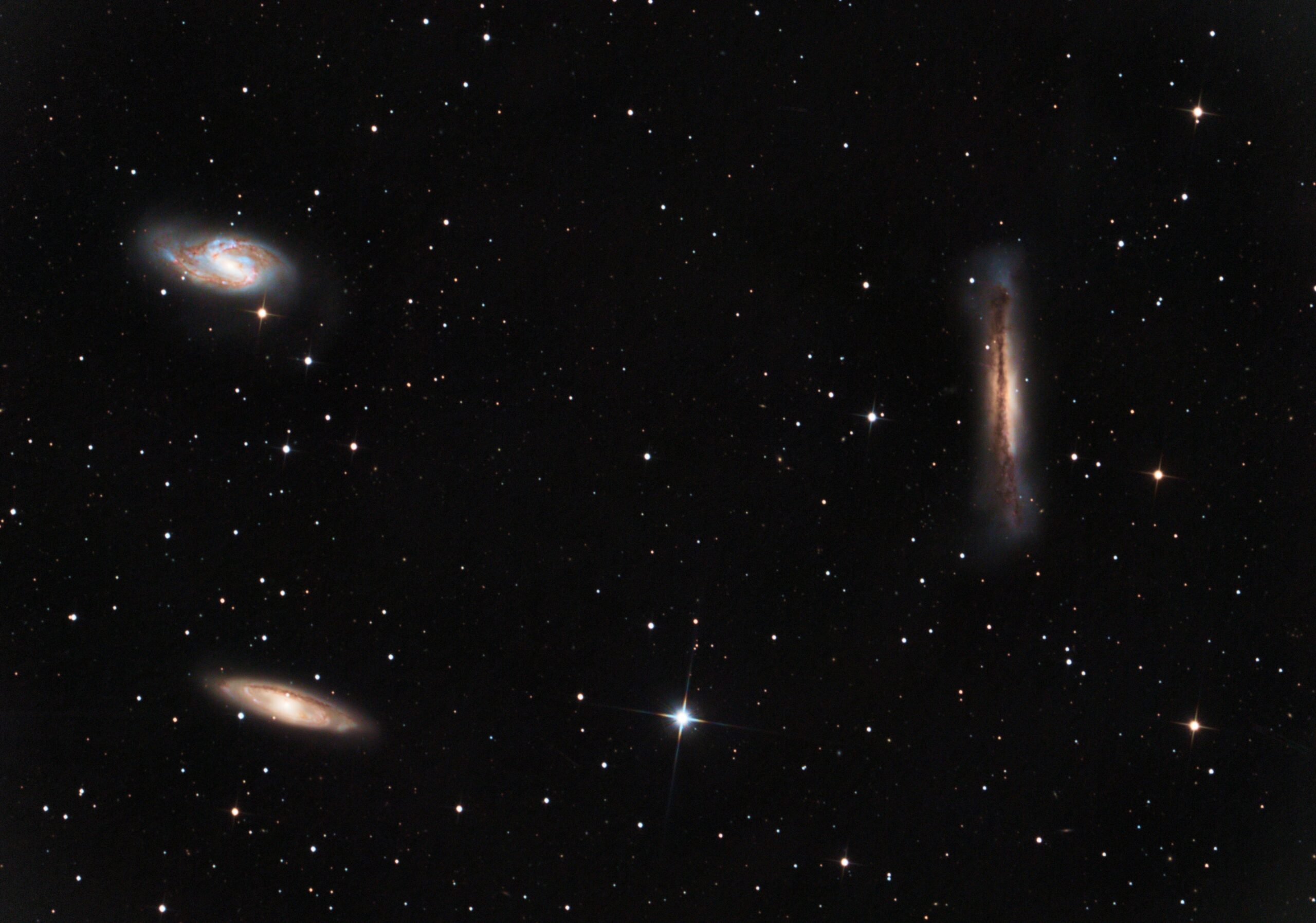 Il Tripletto del Leone è un complesso di 3 galassie che interagiscono tra loro e che, come ci dice il nome, si trova proprio nella costellazione del Leone. Hanno tutte una struttura a spirale e la loro luce impiega 35 milioni di anni per raggiungerci.