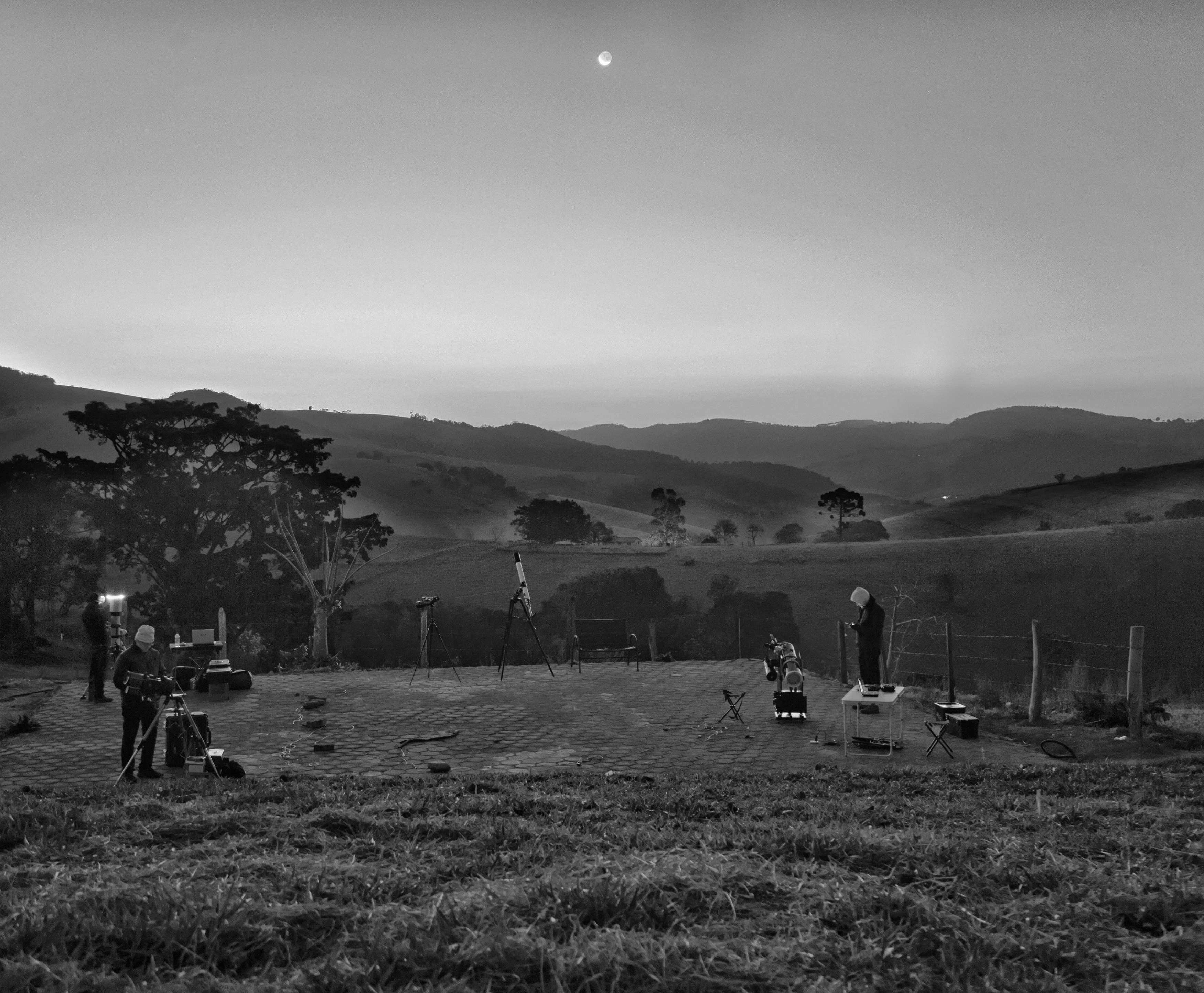 Cette image que j’ai laissée en nuances de gris, pour incorporer un autre environnement, pour montrer, toute la ruée des amis se préparant pour le crépuscule, la petite brume entre les collines, le crépuscule lunaire, commençant une nuit d’observation.