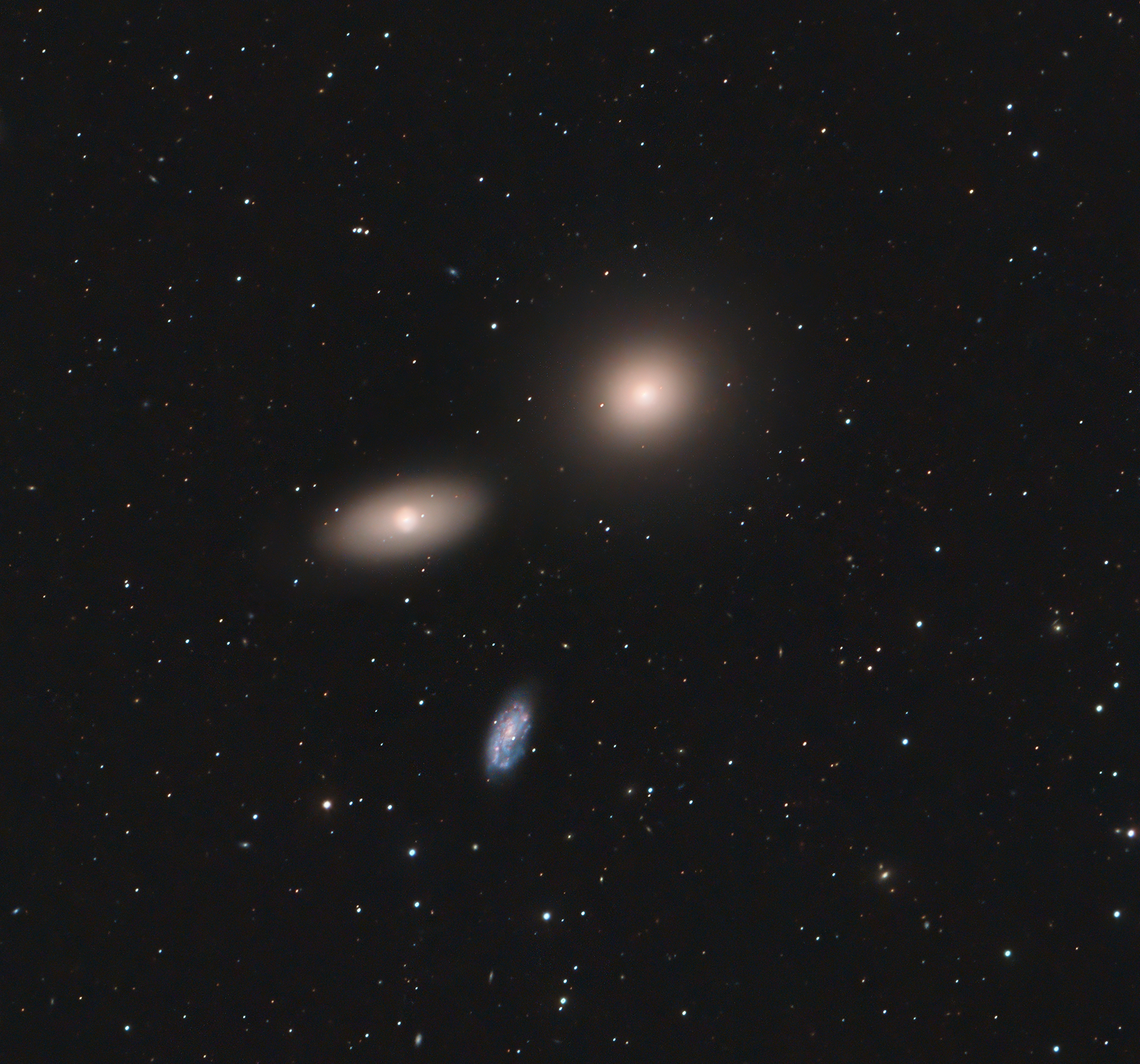 Il trio di galassie forma l’immagine di un volto, con NGC 3384 nell’angolo in alto a destra, M105 (chiamata anche NGC 3379) nell’angolo in alto a sinistra e sotto, formando la bocca, abbiamo NGC 3389