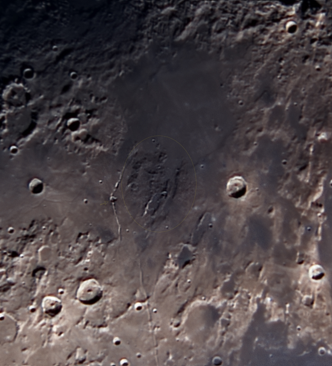Il est considéré comme le plus grand cratère d’origine volcanique sur la face visible de la Lune. Situé au centre de la rime Hyginus, qui a probablement été formée par la lave de ce cratère (FLÈCHE)