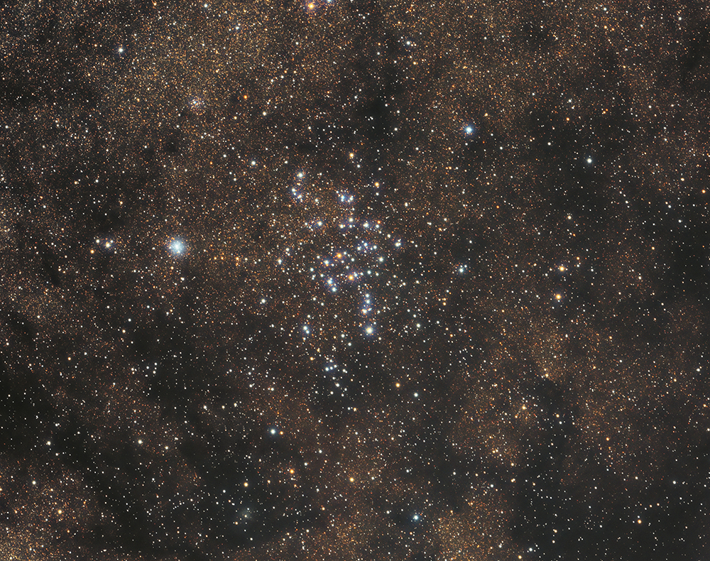 The cluster lies at a distance of 2,150 light Years from Earth and has an apparent magnitude of 6.9.