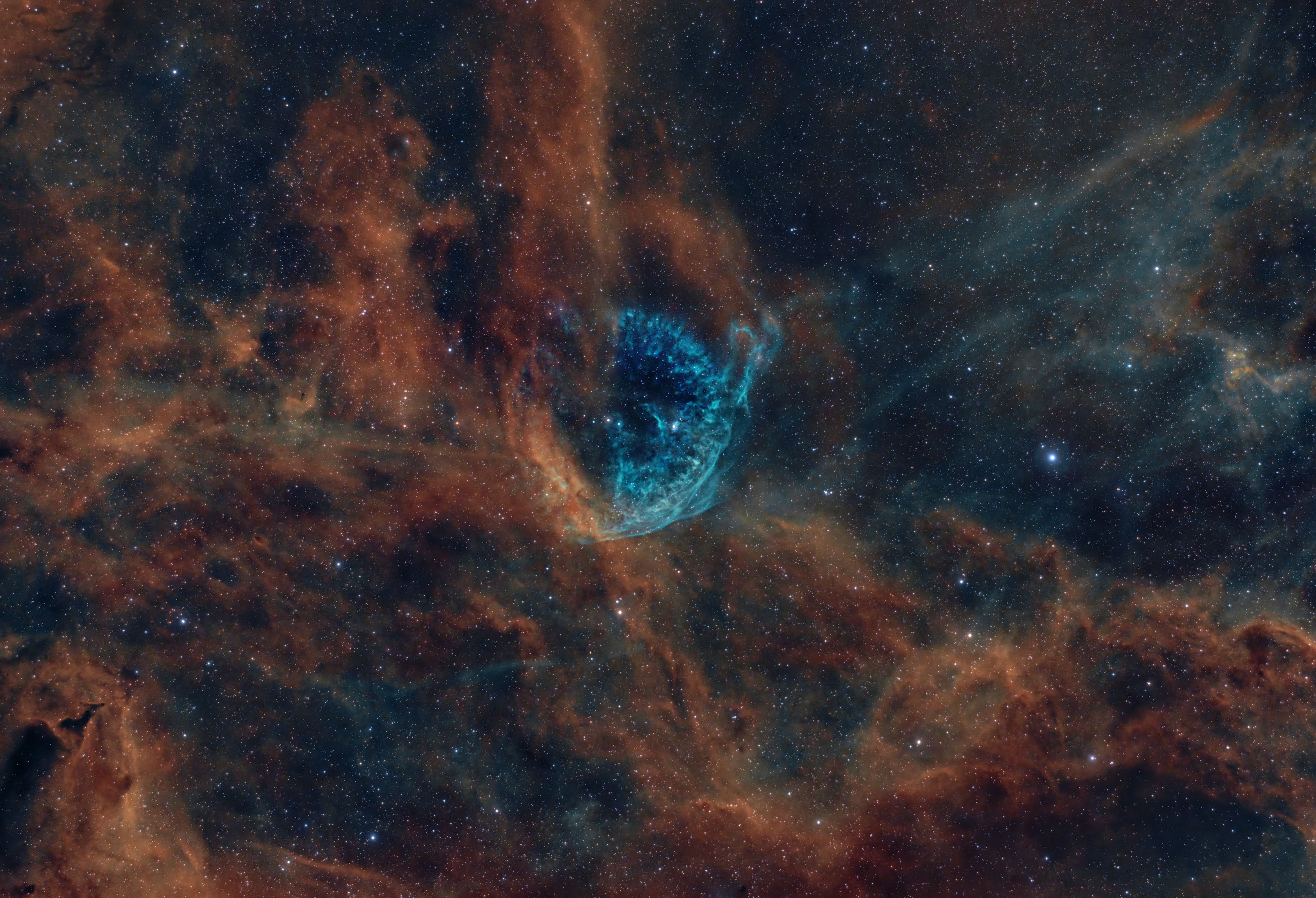 Wolf-Rayet 134 è una stella variabile situata a circa 6.000 anni luce dalla Terra nella costellazione del Cigno, circondata da una debole nebulosa. WR 134 è visibile proprio al centro della bolla di gas come la stella giallastra più luminosa.