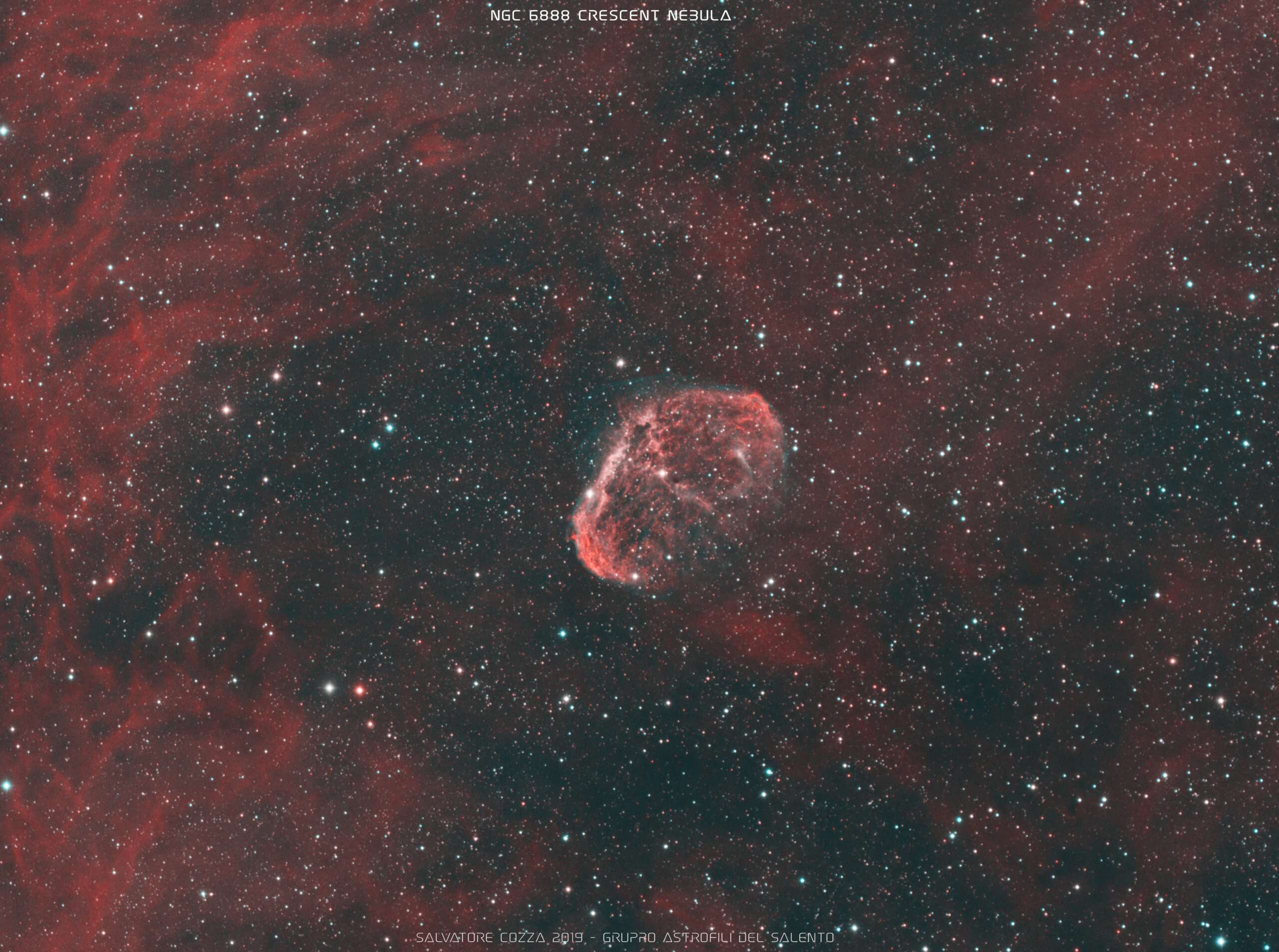 NGC 6888, nota anche come Nebulosa Crescente, è una nebulosa diffusa visibile nella parte meridionale della costellazione del Cigno. Secondo alcuni studi si tratterebbe del resto di una supernova, una stella di grande massa esplosa in passato. Nel giro di pochi millenni si prevede che l’oggetto svanirà del tutto. E’ un oggetto difficile da riprendere in quanto presenta un "guscio" in ossigeno che ha bisogno di lunghe integrazioni in banda stretta per essere evidenziato.