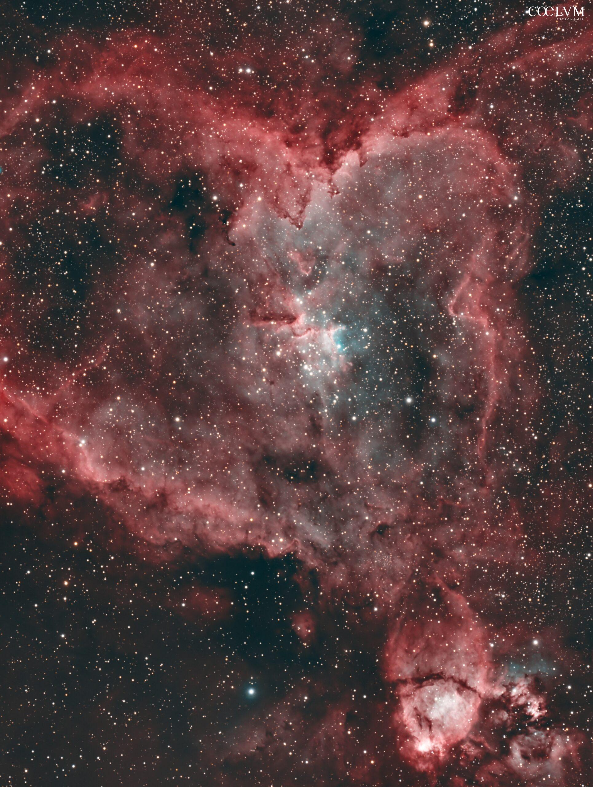 La Nebulosa Cuore (IC 1805) è una vasta regione di idrogeno ionizzato situata nella costellazione di Cassiopea, a una distanza di circa 7.500 anni luce. Le emissioni sono principalmente dovute all’azione dell’ammasso stellare giovane Melotte 15, le cui stelle massicce scolpiscono il gas circostante attraverso intense radiazioni ultraviolette e venti stellari. L’immagine evidenzia le strutture filamentari e le zone di maggiore densità della nebulosa, con particolare risalto alle emissioni in Hα e OIII, che permettono di distinguere le aree di ionizzazione più attiva. Dati di ripresa: Rifrattore ED80 con riduttore di focale 0,8× · Camera QHY163C · Filtro Optolong L-eNhance · Pose singole da 300 s · Integrazione totale: 12 ore ·