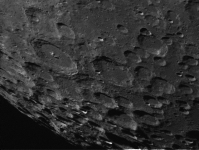 Particolare polo sud lunare. Elaborazione di circa 1600 fits con RegiStax6. Ripresa effettuata con Atik titan monocromatica e newton 200mm su neq6 pro.