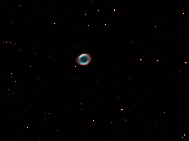 Ripresa della nebulosa m57. Somma di tre pose da 300s effettuate con atik titan monocromatica e filtri RGB al fuoco di newton 200mm su n-eq6pro. Tutto guidato con rifrattore 80/400 e magzero mz5m. Elaborazione effettuata con iris.