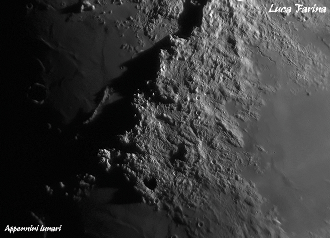 Affascinato dalle ombre che gli Appennini proiettavano sul suolo del nostro satellite ho tentato una ripresa. Filtro ir-pass 807 Astronomick e Dmk21.