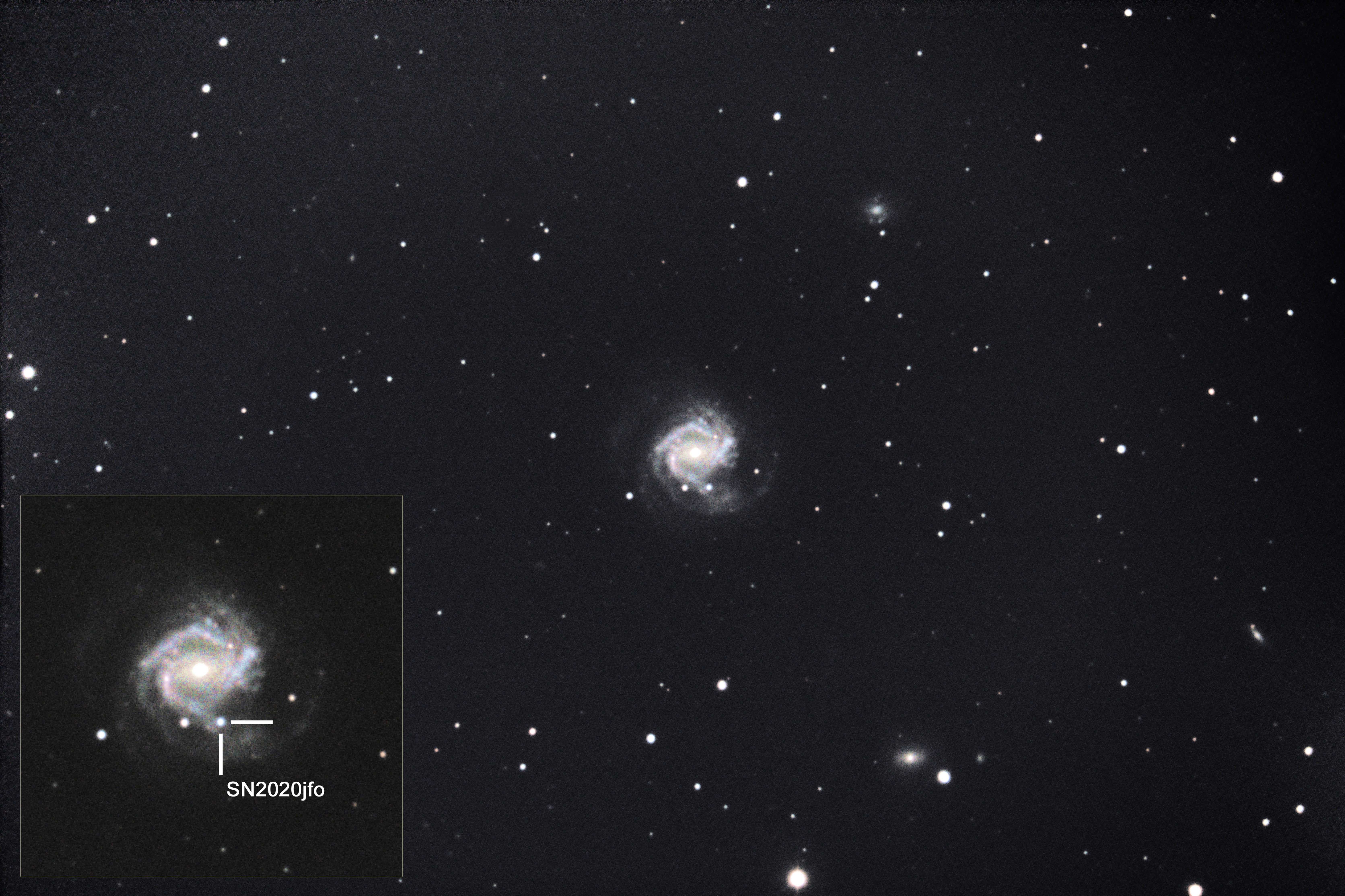 Un’ora di integrazione con 12 pose di 5′ ciascuna a 800 ISO con reflex Canon 350D modificata.
