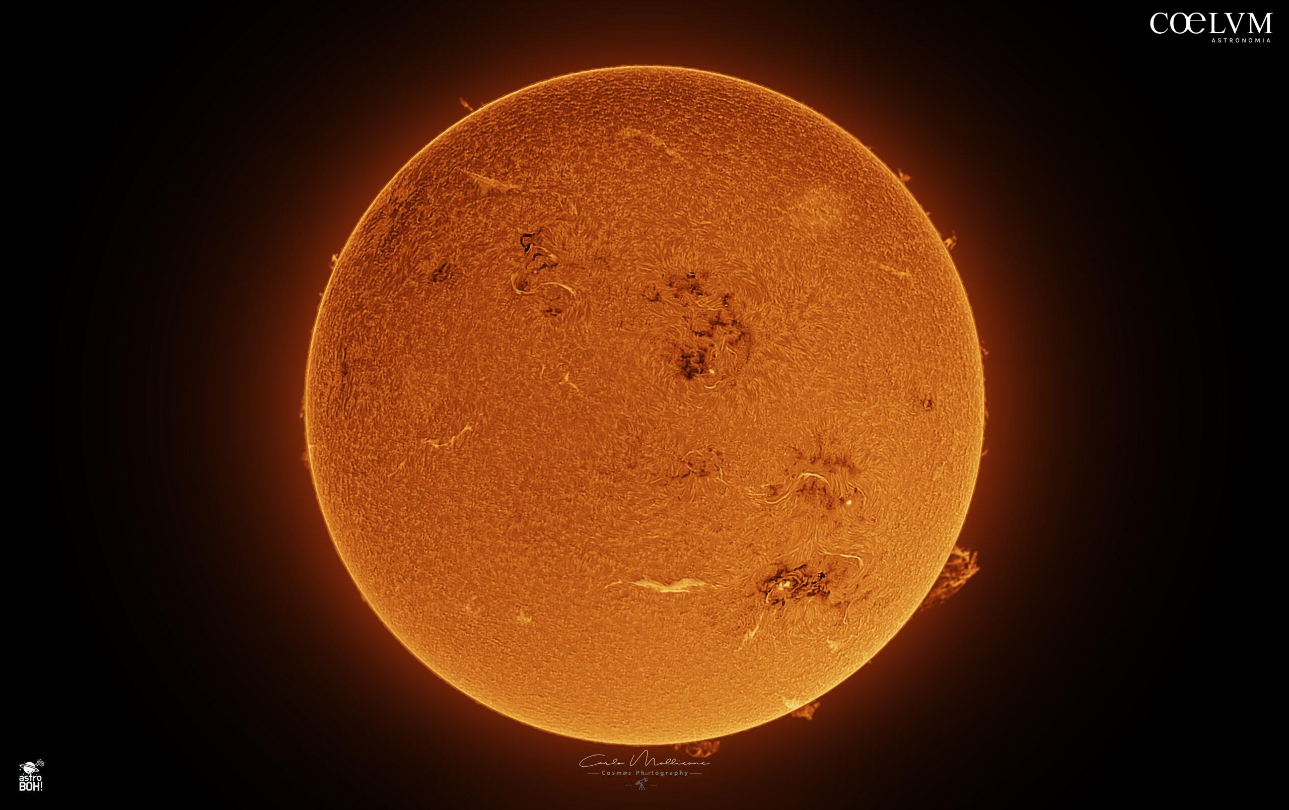 Questa è la mia prima immagine solare con un telescopio dedicato all’H-alpha. L’elevato livello di dettaglio è dovuto all’ottima uniformità del filtro etalon, che isola una banda estremamente stretta di circa 5–6 Å, consentendo di osservare la cromosfera in modo selettivo e con elevato contrasto. Il cerchio di Nisquit copre in modo ottimale il disco solare, garantendo un’illuminazione uniforme e priva di gradienti. Nell’immagine sono chiaramente visibili le protuberanze in emissione lungo il bordo, insieme a numerose strutture cromosferiche come filamenti, facole e regioni di intensa attività magnetica. Un risultato che evidenzia le potenzialità dell’imaging in banda stretta applicato allo studio dinamico della superficie solare. Dettagli Tecnici dell’Acquisizione: Strumentazione: 🔭 Telescopio Principale : Sky-Watcher Heliostar 76mm H-alpha 🔬 Montatura : SkyWatcher Wave 150i 📸 Camera di Acquisizione : ZWO ASI 174MM mini 💻 Software di Acquisizione : SharpCap 🛠️ Software di Elaborazione : Photoshop