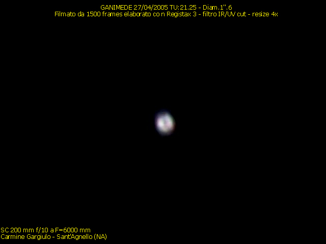 Macchie di albedo su Ganimede. Focale equivalente di 6000 mm (t=1/25 s, resize 4 x), elaborazione con Registax 3 di un filmato AVI di 1500 frames.Il filmato è stato ripreso con una webcam Philips Vesta + filtro IR cut collegata ad un telescopio SC 200/2000 mm.