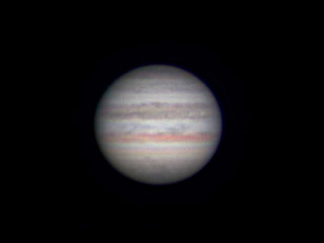 Giove 20 Giugno 2008. Ripresa di Giove in quadricromia usando per la luminanza un’immagine ottenuta con la Magzero B & N con filtro IR pass e per crominanza un’immagine ottenuta con la Philips Vesta con un filtro IR cut.