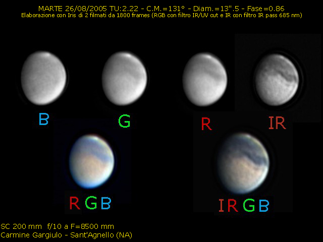 Marte 26 Agosto 2005. Focale equivalente di 8500 mm (t=1/25 s, resize 1.2 x), elaborazione con Iris 4 di 2 filmati AVI da 1800 frames (RGB con filtro IR cut + I con filtro IR pass 685 nm).I filmati sono stato ripresi con una webcam Philips Vesta + Barlow 3X COMA apocromatica collegata ad un telescopio SC 200/2000.