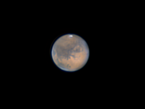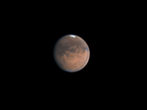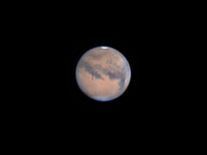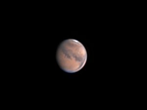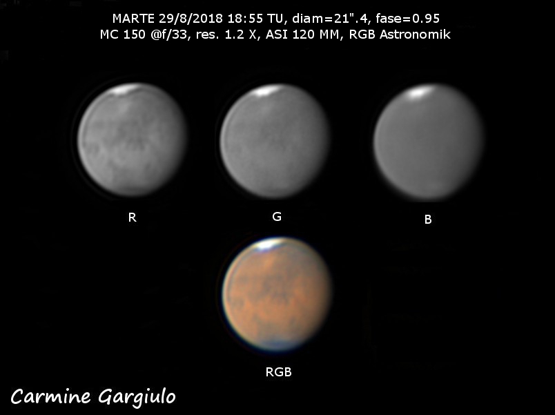 Tricromia di Marte eseguita con un MAK 150 e camera ASI 120 MM con filtri RGB Astronomik. Con la tempesta in fase di attenuazione adesso si possono ottenere delle buone immagini senza ricorrere al canale infrarosso