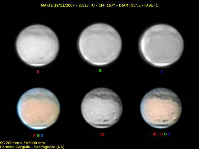 Marte 29 Dicembre 2007 – 23:23 TU. Elaborazione con Iris/Registax di 2 filmati da 2250 frames eseguiti alla focale di 8000 mm su C8 XLT e webcam Philips Vesta.