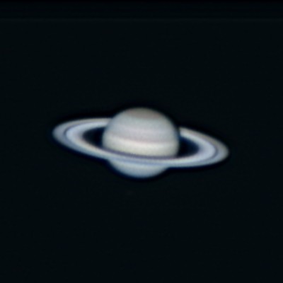 Saturno 5 Marzo 2007. Focale equivalente di 6000 mm (t=1/10 s), elaborazione con Iris (RGB) di un filmato AVI di 1800 frames.Il filmato è stato ripreso con una webcam Philips Vesta + filtro IR cut + Barlow 3X COMA apocromatica collegata ad un telescopio SC 200/2000.