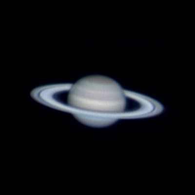 Saturno 7 Febbraio 2007. Focale equivalente di 7000 mm (t=1/10 s), elaborazione con Iris (GRGB) di un filmato AVI di 2000 frames.Il filmato è stato ripreso con una webcam Philips Vesta + filtro IR cut + Barlow 3X COMA apocromatica collegata ad un telescopio SC 200/2000.