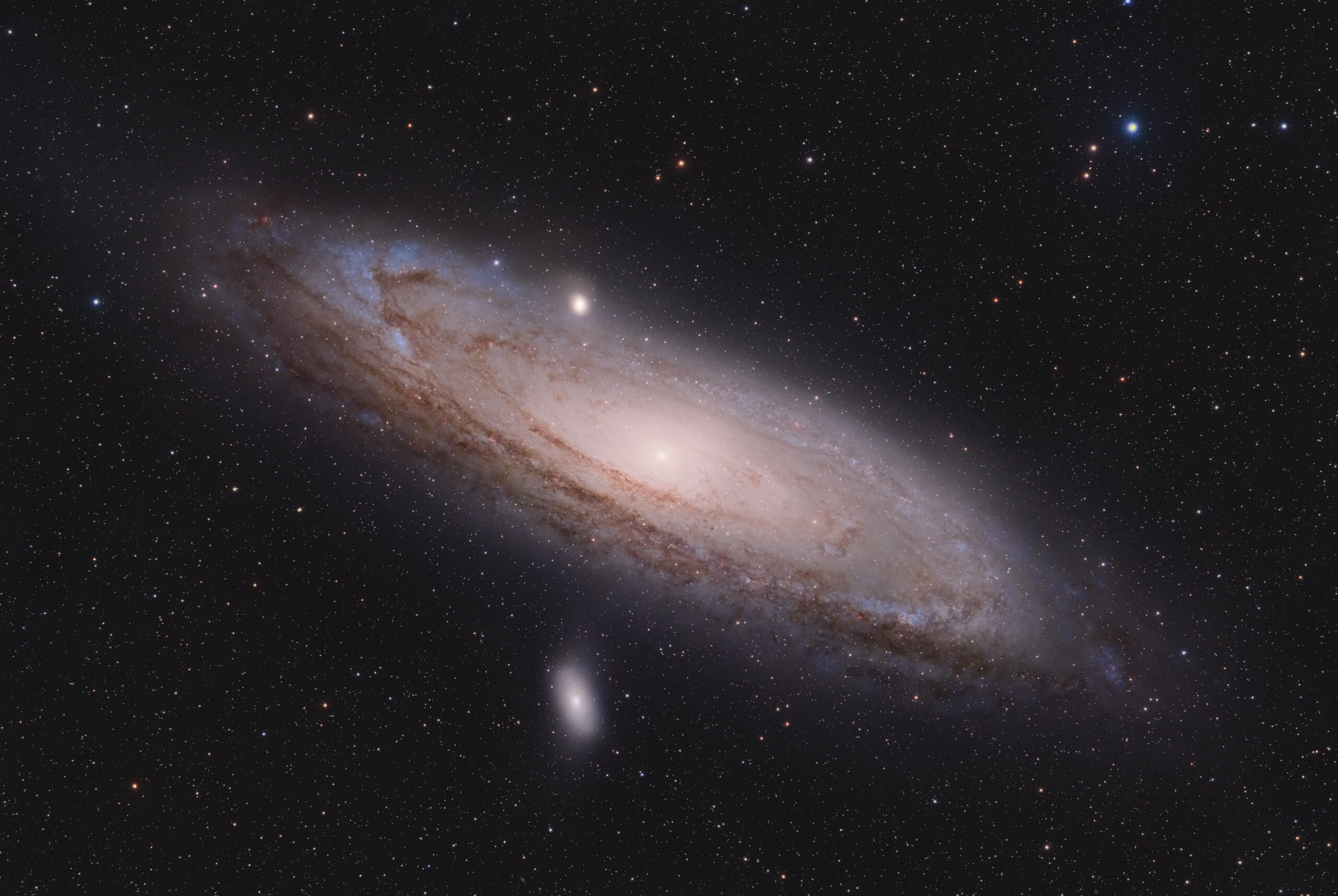 M31 o Galassia di Andromeda: non ha bisogno di presentazioni questa splendida galassia a spirale distante circa 2.5 milioni di anni luce dalla terra. Con le sue due compagne satelliti ellittiche M32 (galassia nana visibile nei pressi delle polveri periferiche superiori di M31) e M110 (visibile in basso sotto M31) formano, insieme ad altre galassie, compresa la nostra via Lattea, il cosiddetto Gruppo Locale, del quale M31 è la componente di dimensioni maggiori (circa 220000 anni luce di diametro). Il numero di stelle è approssimativamente di 1000 miliardi (circa il doppio rispetto a quelle presenti nella Via Lattea.