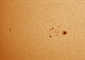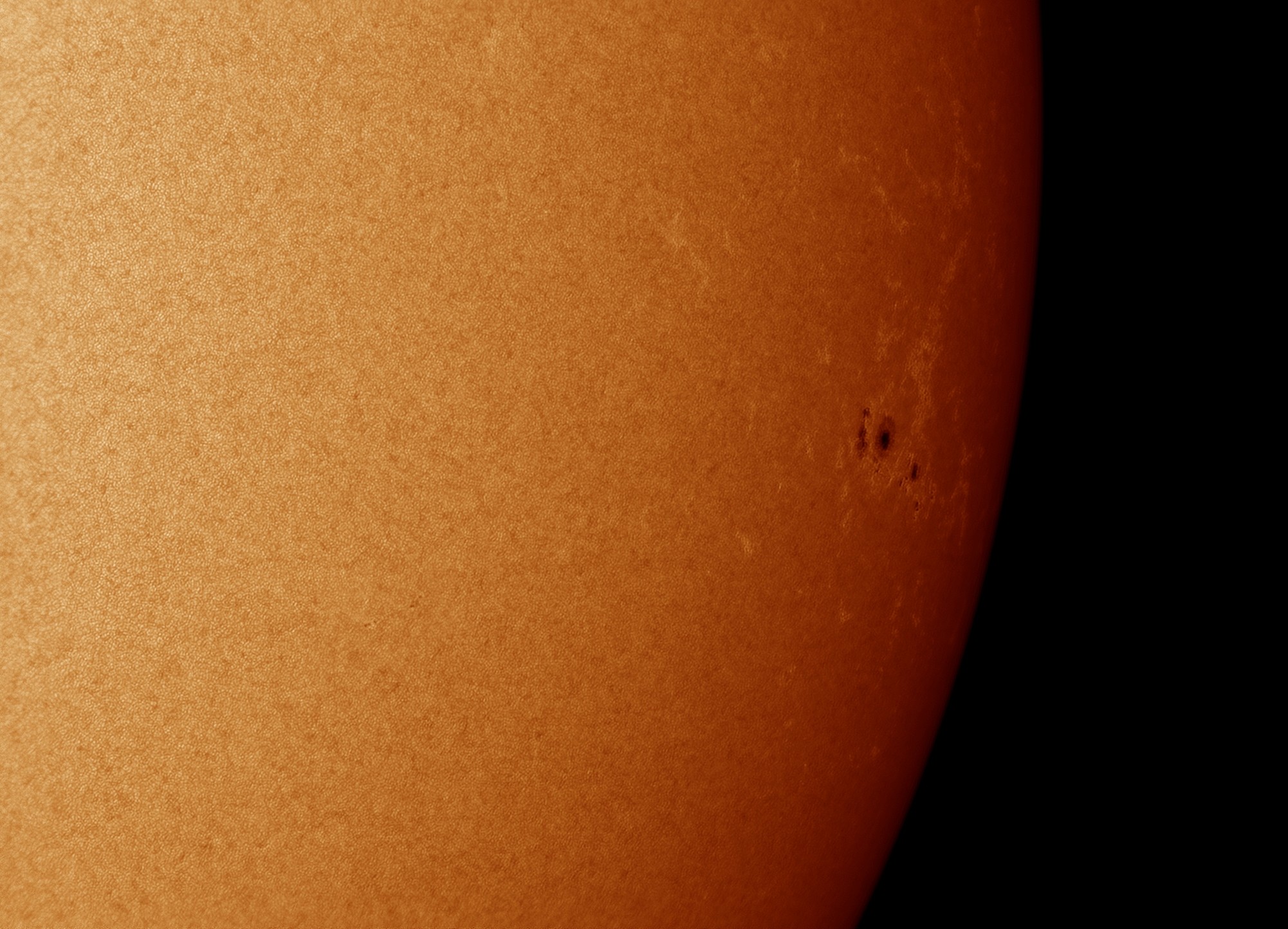 L’iimmagine, in luce bianca, mostra il gruppo di macchie solari NOAA 1719, costituito da 3 spots, in prossimità del bordo del disco solare (N09 W64). Intorno al gruppo, sono evidenti ampie facole ramificate e irregolari.