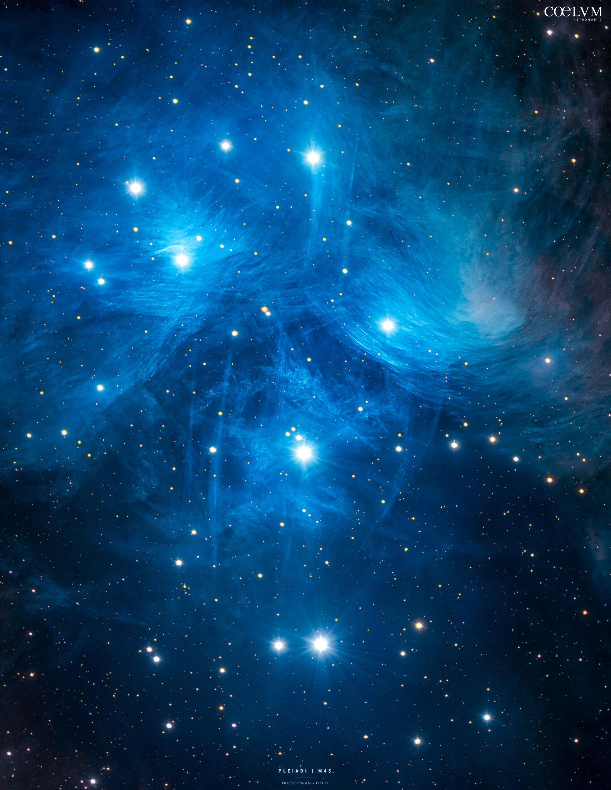 Le Pleiadi (conosciute anche come le Sette sorelle, la Chioccetta o con la sigla M45 del catalogo di Charles Messier) sono un ammasso aperto visibile nella costellazione del Toro. Questo ammasso piuttosto vicino (440 anni luce) conta diverse stelle visibili a occhio nudo. Data la loro distanza, le stelle visibili tra le Pleiadi sono molto più calde del normale, e ciò si riflette nel loro colore: sono giganti blu o bianche; l’ammasso conta in realtà centinaia di altre stelle, molte delle quali sono troppo lontane e fredde per poter essere viste a occhio nudo. Le Pleiadi sono un ammasso giovane, con un’età stimata di circa 100 milioni di anni e una vita prevista di soli altri 250 milioni di anni, dato che le stelle sono troppo lontane tra loro. Da quando si scoprì che le stelle sono corpi celesti simili al Sole, si iniziò a ipotizzare che alcune fossero in qualche modo legate fra loro. Grazie allo studio del moto proprio e alla determinazione scientifica delle distanze degli astri, divenne chiaro che le Pleiadi sono realmente legate gravitazionalmente e che hanno un’origine comune. Le Pleiadi sono possibili osservarle ad occhio nudo nel periodo invernale, anche in cieli prevalentemente inquinati ( Bortle 5 / 6 ). Sii consiglia di utilizzare un piccolo binocolo o un telescopio amatoriale per ammirarla in tutta la sua bellezza cosmica! ☆ Credit: DRO ( Alessandro Passeggia ), NOOBTonian. Cieli Sereni!