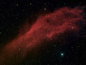Gruppo di nebulose ad emissione nella costellazione d’Auriga. Da sinistra a destra la piccola IC417, IC1893 e IC405. Eliminando 2 esposizioni per cattiva ripresa (passaggio di nuvole) e l’ultima perchè sono andato troppo oltre la notte astronomica (ero in presenza della luce dell’alba), alla fine ho raccolto 41 esposizioni da 900 secondi. Totale finale: 10 ore e 25 minuti. Visto la presenza della Luna quasi piena nella vicinanza e il cielo leggermente umido ho deciso di non riprendere in colore ma di dedicato tutto il tempo alla ripresa in Ha.