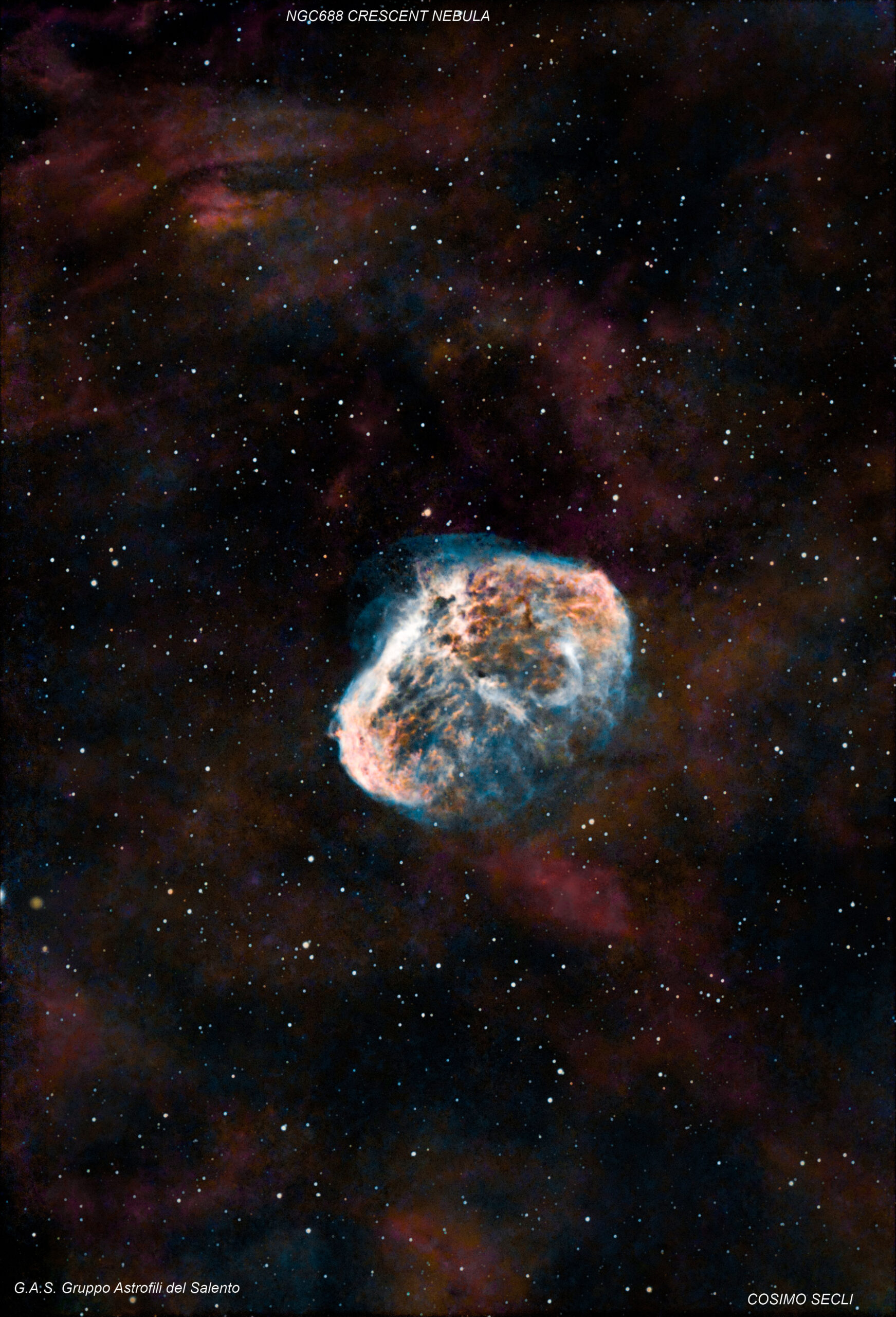 La Nebulosa Crescent NGC 6888 è una nebulosa diffusa ad emissione situata nella Costellazione del Cigno a circa 5000 anni luce dalla Terra. All’interno della nube è visibile la stella centrale classificata come Stella Wolf-Rayet ( WR 136 ). Questo astro ardente sparge il suo involucro esterno tramite un forte vento stellare, espellendo l’equivalente di una massa solare ogni 10000 anni. Le complesse strutture della nebulosa sono probabilmente il risultato del poderoso vento che interagisce con materiale espulso in una fase precedente. Essa mostra emissione di atomi di Idrogeno ( rosso ) e atomi di Ossigeno ( ciano).