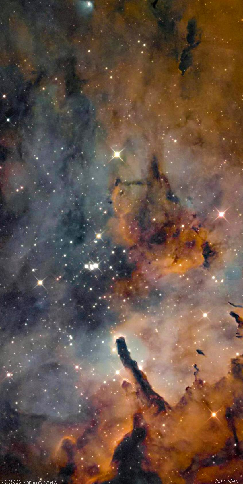 NGC6823 – AMMASSO STELLARE APERTO NGC6823 è un ammasso stellare aperto all’interno di NGC6820 , una piccola nebulosa a riflessione nella Costellazione della Volpetta. La nebulosa a riflessione e il cluster sono incorporati in una grande nebulosa a emissione debole chiamata SH2-86. La nebulosa non è molto luminosa ma contiene alcune interessanti strutture a pilastro e globuli di BOK. I globuli di Bok sono dense nubi di gas e polveri interstellari in cui sta avvenendo la formazione stellare. Sono visibili come macchie scure su un fondo luminoso di stelle , che bloccano la luce delle stelle retrostanti. Sono estremamente freddi ( – 260°C ) e le loro dimensioni sono di qualche anno luce e possono variare da poche a diverse centinaia di masse solari. L’intera area della nebulosità viene spesso definita NGC6820. L’ammasso stellare aperto NGC6823 è lungo circa 50 anni luce e si trova a circa 6000 anni luce di distanza. Il centro dell’ammasso si è formato circa 2 milioni di anni fa ed è dominato dalla luminosità da una schiera di giovani stelle brillanti. Le parti esterne del cluster contengono anche stelle più giovani. Costituisce il nucleo dell’Associazione della Volpetta OB1.
