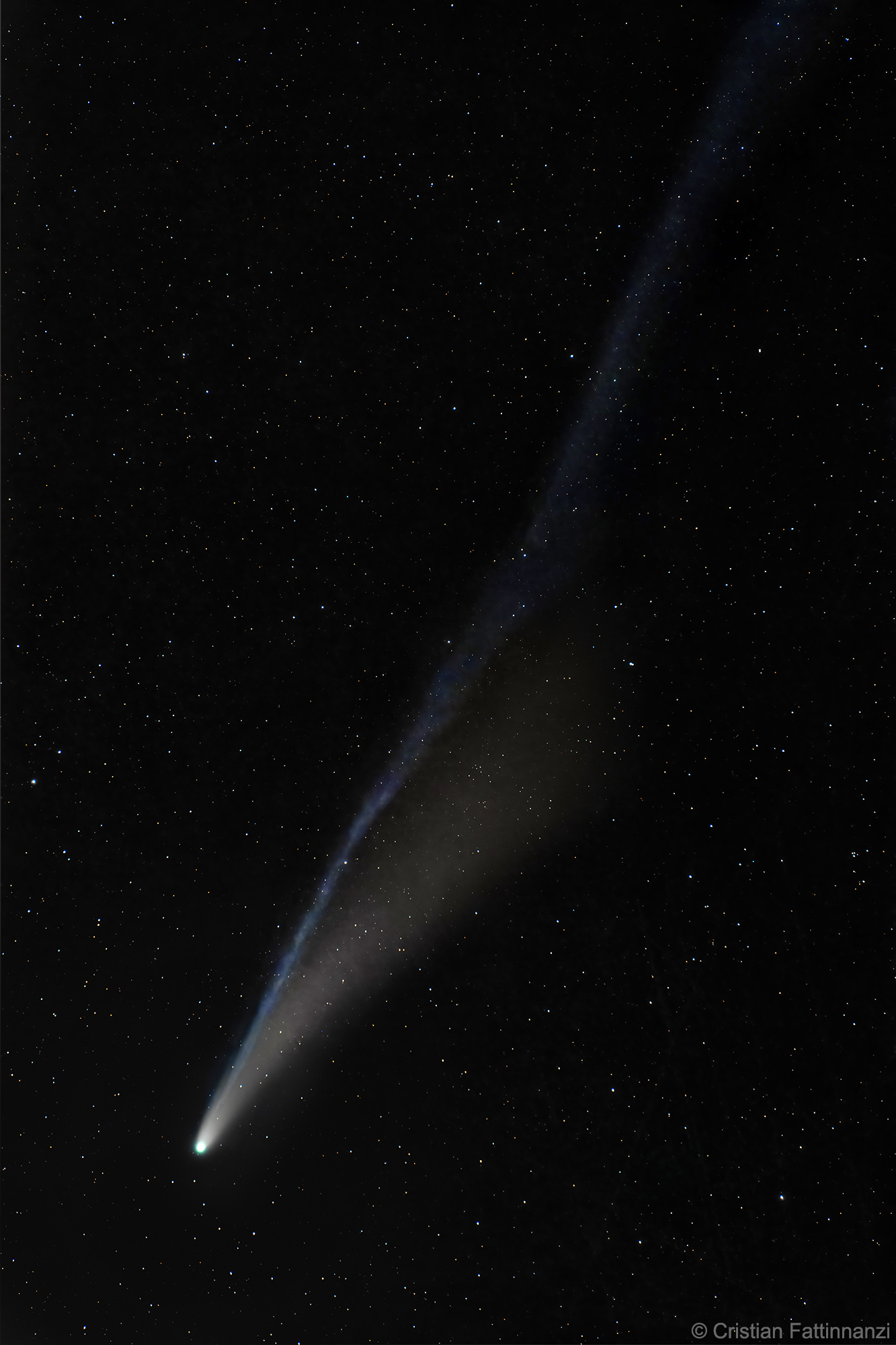 Un altro scatto della cometa C2025 A6 Lemmon, eseguito la sera del 28 ottobre dal terrazzo di casa a Montecassiano (MC – ITALY). Elaborazione complicata come sempre a causa dei fastidiosi gradienti dovuti alla vicinanza con l’orizzonte… per fortuna mi ha dato una mano l’amico Stefano Fantasia per risolvere questi problemi. La coda di gas, azzurra, si conferma molto dinamica ed interessante. Speriamo di riuscire a seguirne ancora l’evoluzione, anche se la Luna inizia ad essere un po’ invadente… Reflex FF ed obiettivo 70-200 2,8 con duplicatore 1,4x, quindi 280mm F/5.