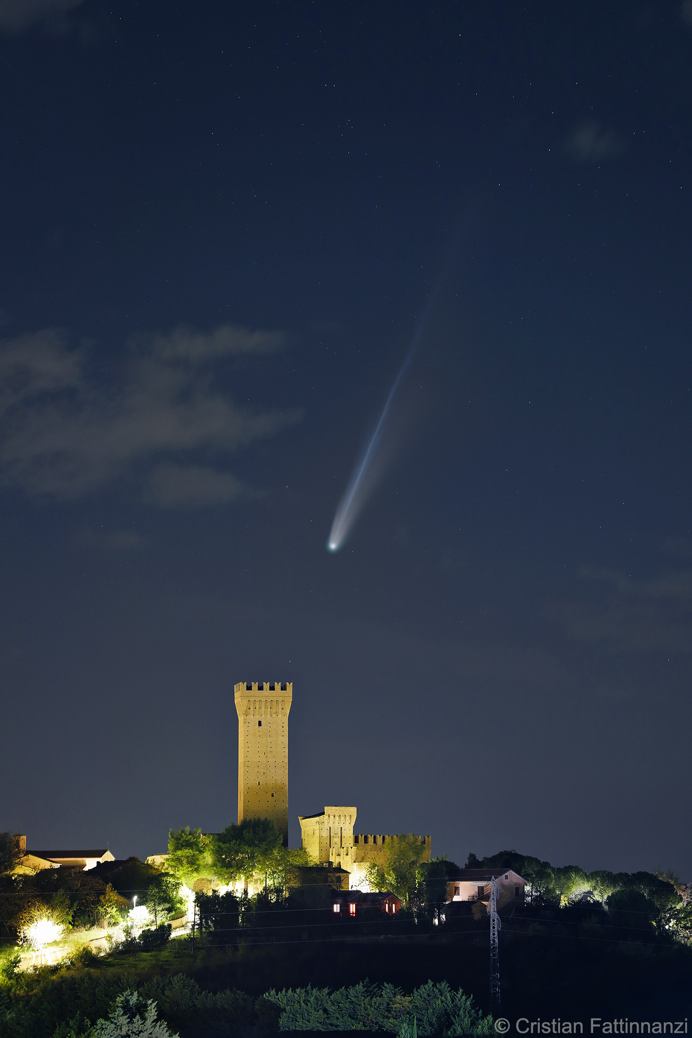 Dopo un lungo lavoro di post-processing sono riuscito ad ultimare le immagini ottenute la sera del 24 ottobre. Per cercare di ambientare la cometa sono andato a Montefano, a qualche km da casa, dove la torre del castello di Montefiore ha stuzzicato il mio interesse. L’immagine è ottenuta con un 200mm F/2,8, inserendo l’immagine ottenuta con un 400mm nella scala e giusta posizione rispetto al contesto paesaggistico.
