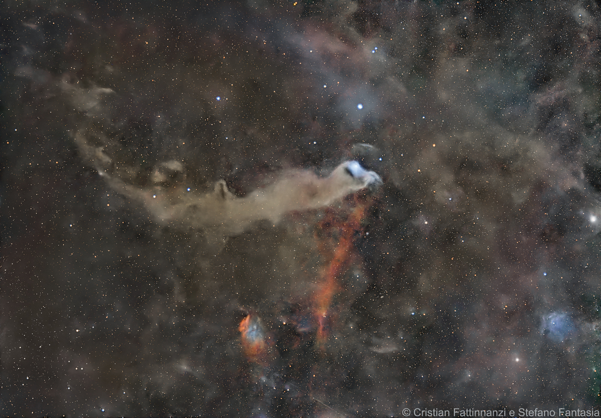 Un’altra immagine frutto del lavoro congiunto tra me e Stefano Fantasia: questa volta abbiamo voluto dirigere l’ottica verso un oggetto meno noto, il complesso nebulare VdB 152 (a forma di verme), nella costellazione del Cefeo. Benchè il nome VdB 152 venga usato per riferirsi all’intera nebulosa, in realtà questo si riferisce solo alla nebulosa a riflessione. La “testa del verme”, di colore bluastro, è denominata invece Barnard 175. Si tratta di un globulo di Bok, ovvero una nube formata da gas e polveri molto dense, in cui sta avvenendo il processo di formazione stellare. Immagine ottenuta integrando circa un’ora di acquisizione con filtro multibanda e mezz’ora in H-alfa. Ottica 400mm F/2,8 e camera di ripresa ZWO 294 MC Pro Color. Processing svolto principalmente da Stefano, da parte mia solo ritocchi finali con Photoshop.
