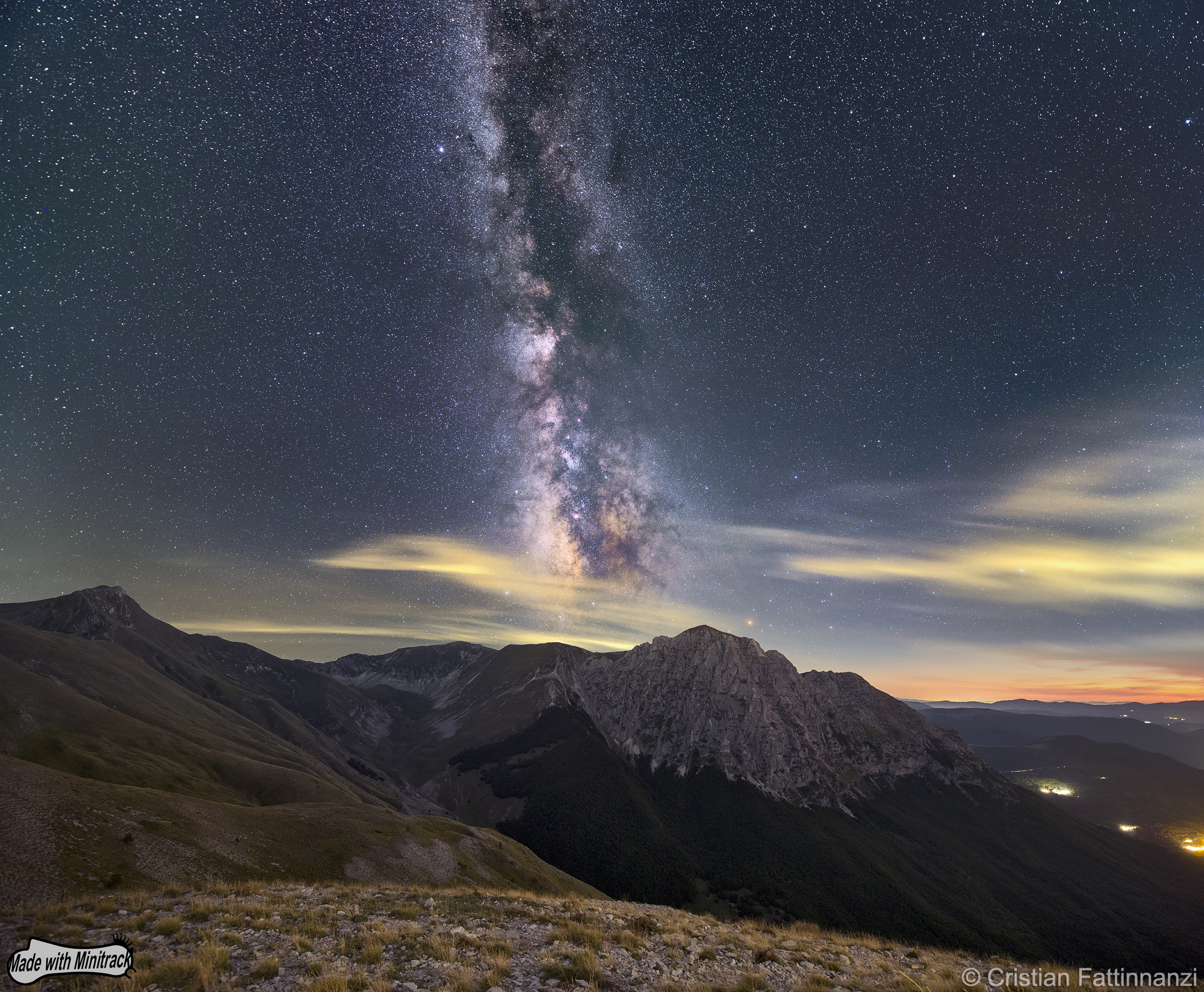La sera del 19 settembre al Rifugio del Fargno (MC – ITALY) il cielo, seppur leggermente velato, mi ha permesso di ottenere questo risultato, una Via Lattea ormai altissima che punta dritta sul Monte Bove. Dopo la consueta ottima cena al rifugio, ottima serata anche al telescopio, grazie al cielo buio dei 1800 metri di quota. Reflex FF modificata Baader, 14mm F/3,2. 3 scatti da 4 minuti ad 800 iso per il suolo, 6 scatti con gli stessi parametri per il cielo. Inseguimento con Omegon Minitrack LX4.
